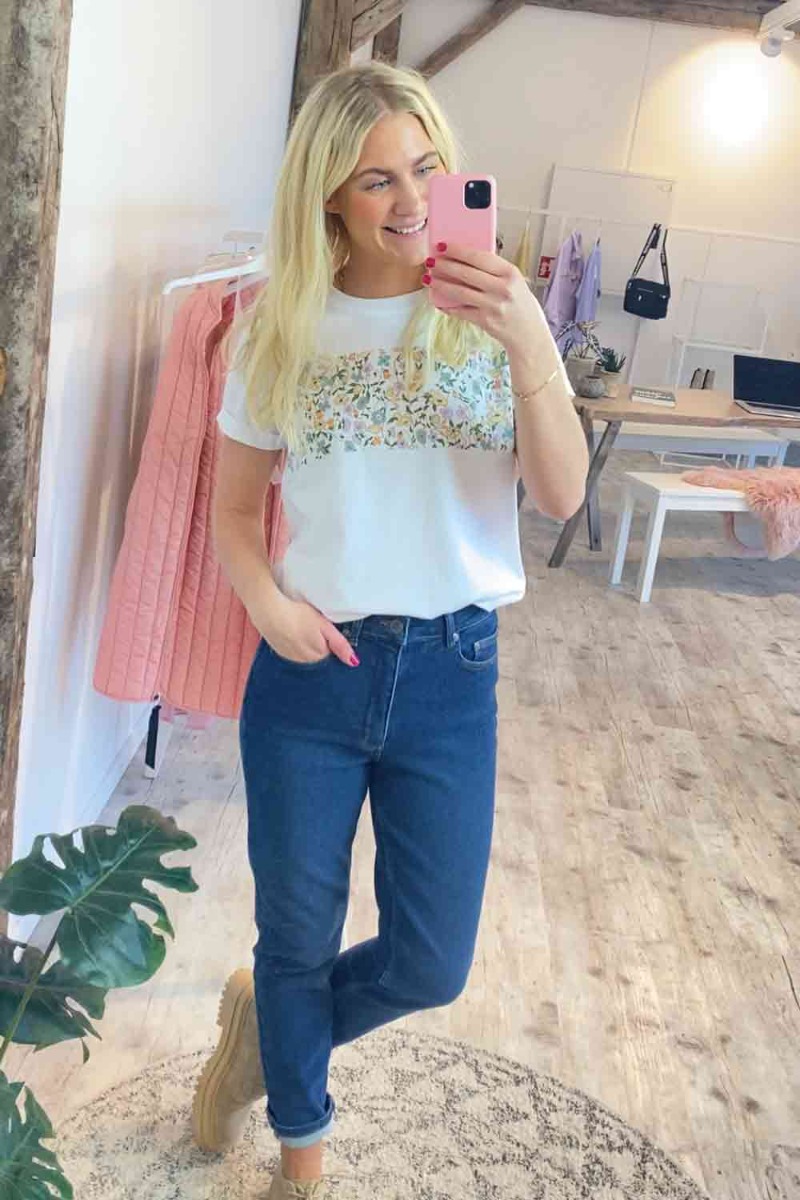 Sød t-shirt fra Nümph i hvid med et blomster tryk over brystet. T-shirten har en klassisk pasform med rund halsudskæring. Den er super nem at style til hverdag med et par denim jeans eller sorte bukser.
