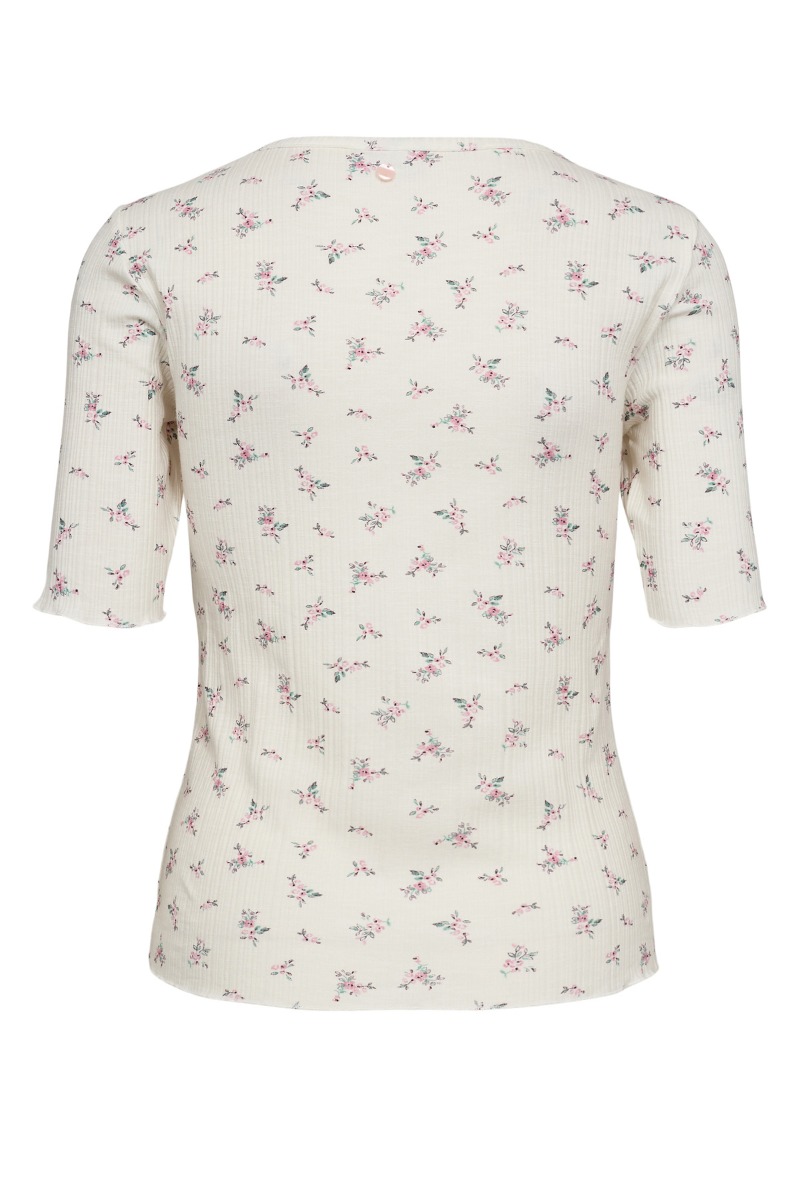 Sød t-shirt fra Nümph. Denne t-shirt har en fin farve med søde små blomster i lyserød. Den er feminin og virkelig fin til hverdag.