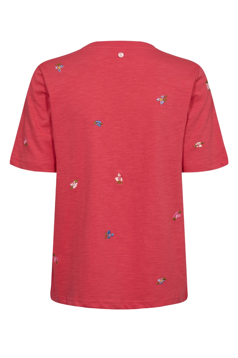 En sød t-shirt fra Nümph. Denne t-shirt har en flot rød farve med søde detaljer af broderede blomster. Den er super fin til hverdag med et par smarte bukser eller en sød nederdel.
