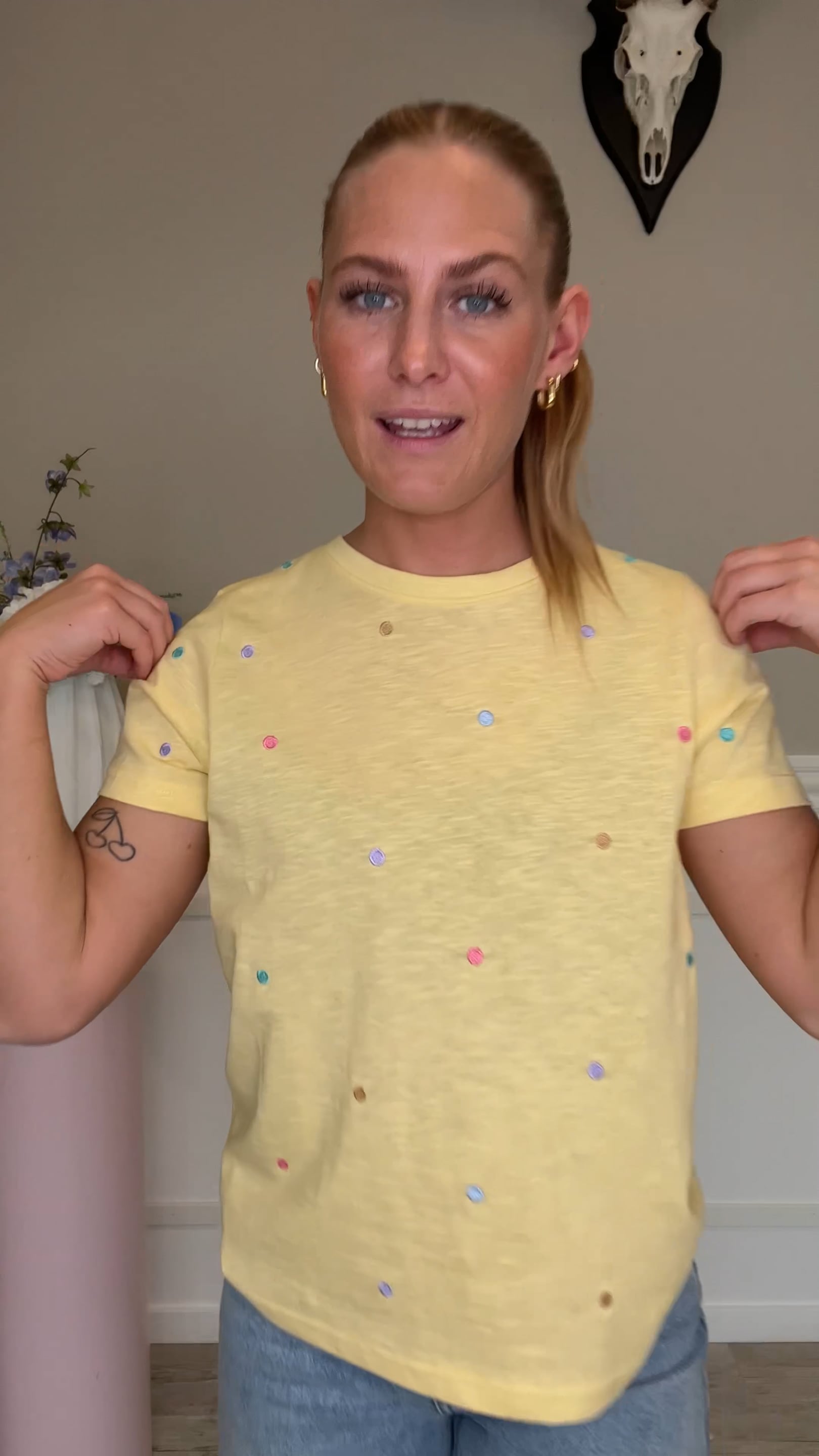 En sød t-shirt fra Nümph. Denne t-shirt har en rød farve med små prikker i flotte, lyse farvenuancer. Den er enkel med virkelig fin til hverdag.