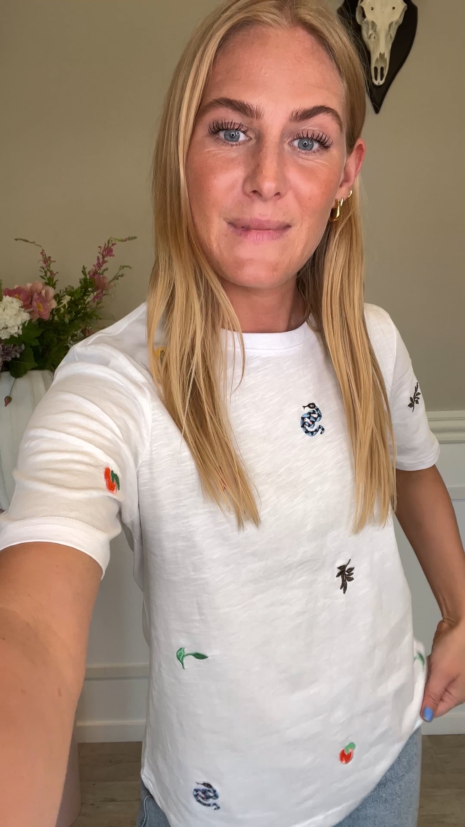 En super fin t-shirt fra Nümph. Denne t-shirt har et klassisk snit med de fineste broderede detaljer. T-shirten er super nem at style sammen med hvad end du synes. Brug den evt. sammen med et par shorts eller din favorit nederdel.
