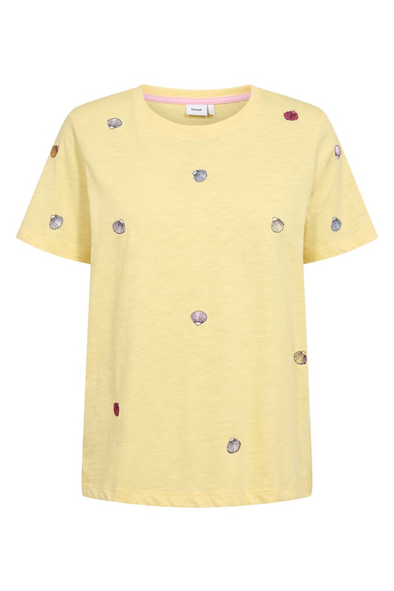Denne lysegule T-shirt fra Nümph har et charmerende, strandinspireret look med små, broderede muslingeskaller i forskellige farver fordelt ud over fronten og ærmerne. Den er fremstillet i blødt bomuldsjersey, som sikrer en behagelig og afslappet pasform. Det klassiske T-shirt design med rund hals og korte ærmer gør den alsidig og let at style til sommerens outfits – både med shorts, nederdele og lette bukser. En skøn, solrig tilføjelse til garderoben, der giver et feminint og legende udtryk.