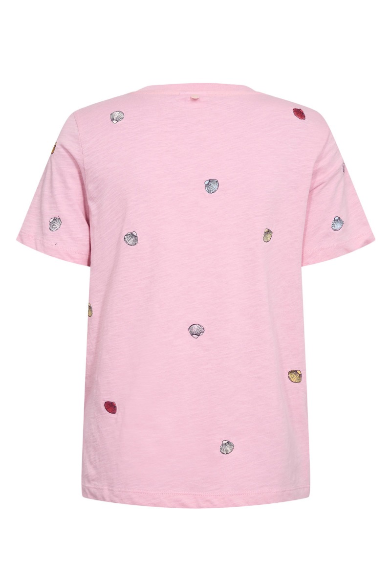 Denne lyserøde T-shirt fra Nümph har et sødt og sommerligt design med små, broderede muslingeskaller i forskellige farver spredt ud over stoffet. Den bløde bomuldsjersey giver en behagelig og afslappet pasform, mens den klassiske rund hals og korte ærmer gør den nem at style til både shorts, nederdele og jeans. Et afslappet, men feminint valg til varme dage, der bringer et strejf af strandstemning ind i hverdagsgarderoben.