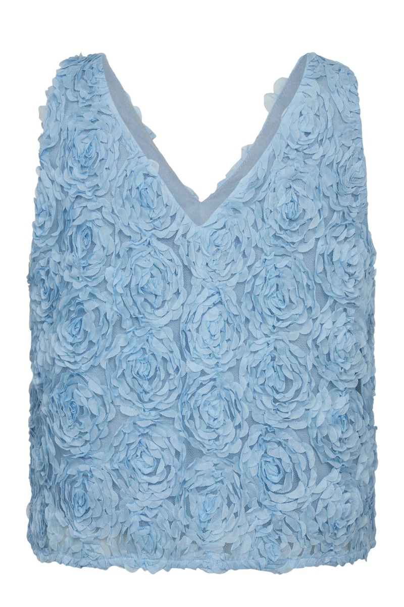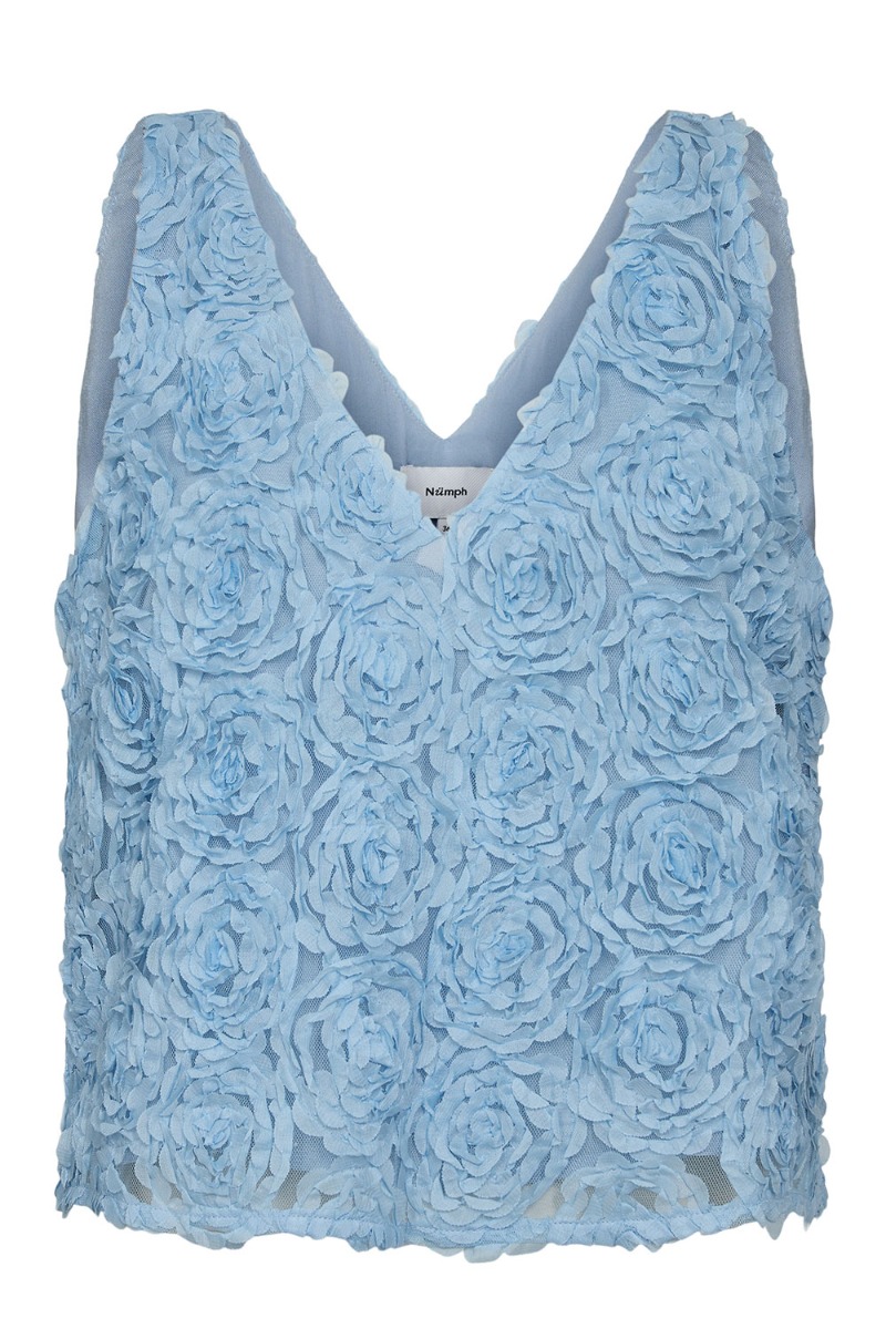 En top i en smuk blå frarve er landet fra Nümph med en flot 3D effekt i stoffet. Den er uden ærmer og er med V udskæring både foran og bagpå. Den passer fint sammen med den matchende nederdel eller måske til hverdag til et par jeans.