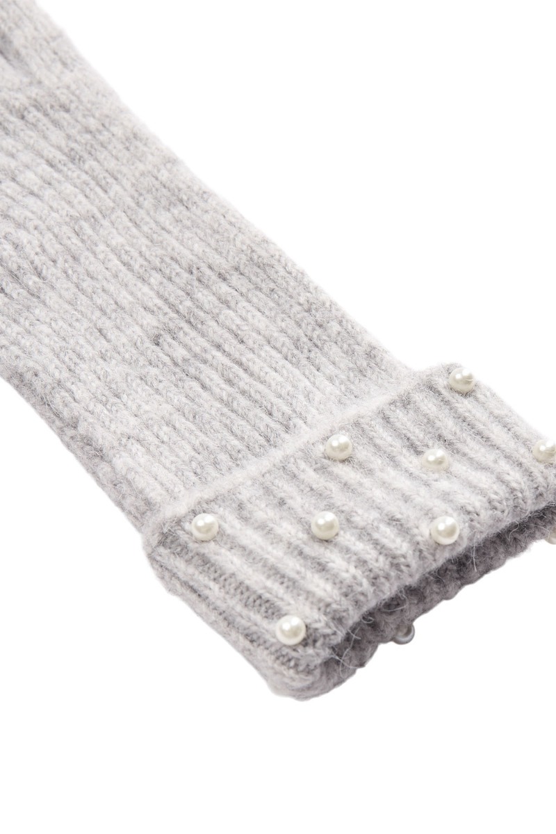 Et par søde vanter fra Nümph er kommet i en blød strik kvalitet. Den er med ekstra længde ved håndleddet, hvor der også er lavet en fold hvor der er påsyet smukke perler i hvid på. De findes også i sort og hele sættet findes i sort.
