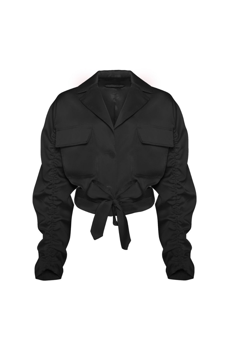 Sej cropped jakke fra OW Collection. En sort satinlook jakke med to knapper foran, lange løstsiddende ærmer med rynkeeffekt og bindebånd i bunden af jakken som giver jakken et både feminint og råt udtryk.