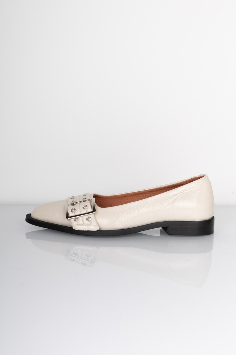 Der er landet de sejeste ballerina sko fra Pavement! Skoen er beige med en lakoverflade, de har en spids snude med et cool sølvspænde, som virkelig giver dem et råt og cool look! Ballerinaskoene har den samme bløde komfort, som pavement virkelige er dygtige til at lave! Style ballerinaskoene til et par brede bukser eller til en nederdel med en lille strømpe i. Denne trend er noget som vi kommer til at se rigtig meget til i 2024!