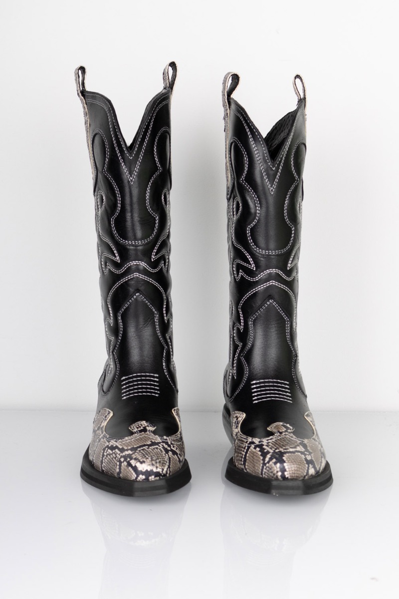 De sejeste cowboystøvler i et snake look fra Pavement. De er i en sort blød læderkvalitet med en spidsere snude, fantastiske at have på og rigtig god komfort. Støvlerne er normale i størrelsen, så tag den størrelse som du plejer. Skal du være med på årets trend, så shop endelig løs af de seje støvler!