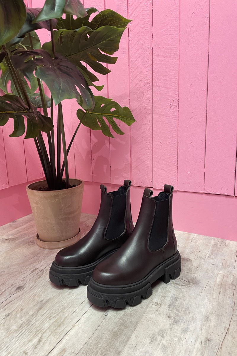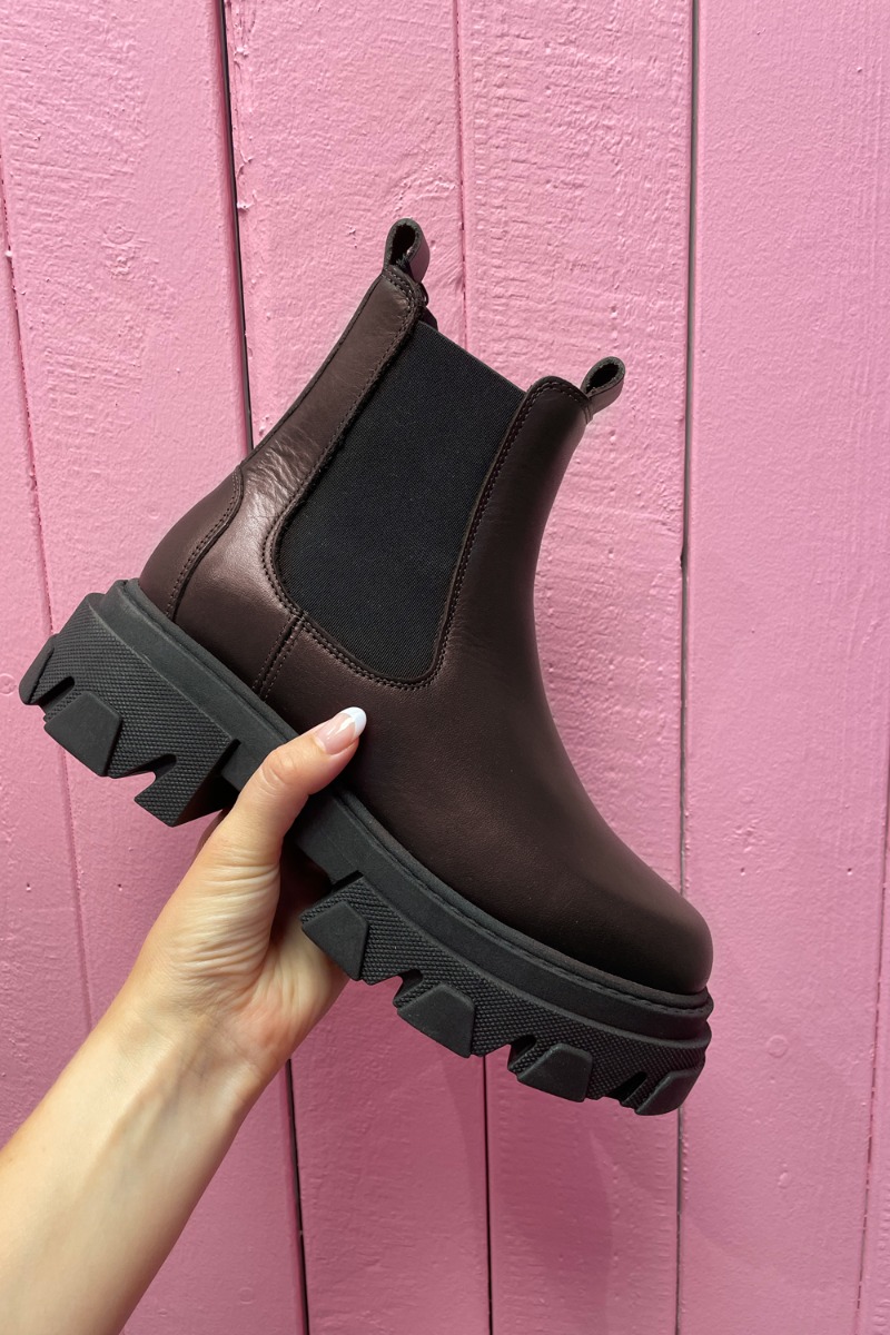 Flotte chelsea boots fra Pavement med chunky sort gummisål. Støvlerne er i en hel dyb mørkebrun farve der sammen med de sorte detaljer giver et virkelig flot look. Støvlerne har elastik på begge sider samt en lille strop både for og bag der gør dem nemme at komme i.