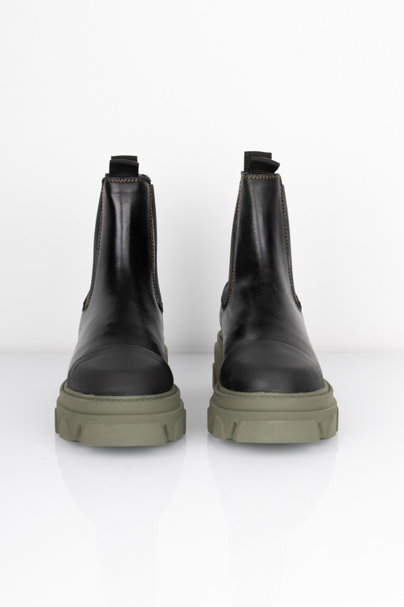 Den klassiske sorte støvle fra Pavement er designet med en rå og trendy bund i army, der giver den sejeste og stilrene look. Støvlen har en sort gummi stykke foran på snuden og ved hælen, der gør den mere slidstærk i det kolde vejr. Støvlen har en blød sål og elastikdetaljer i siderne der gør den behagelig at have på dagen lang.