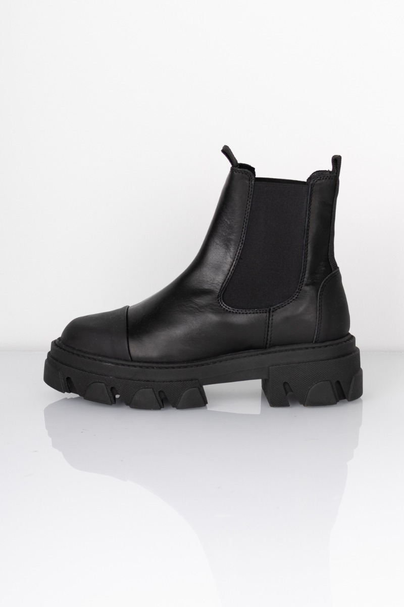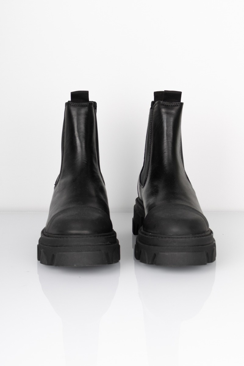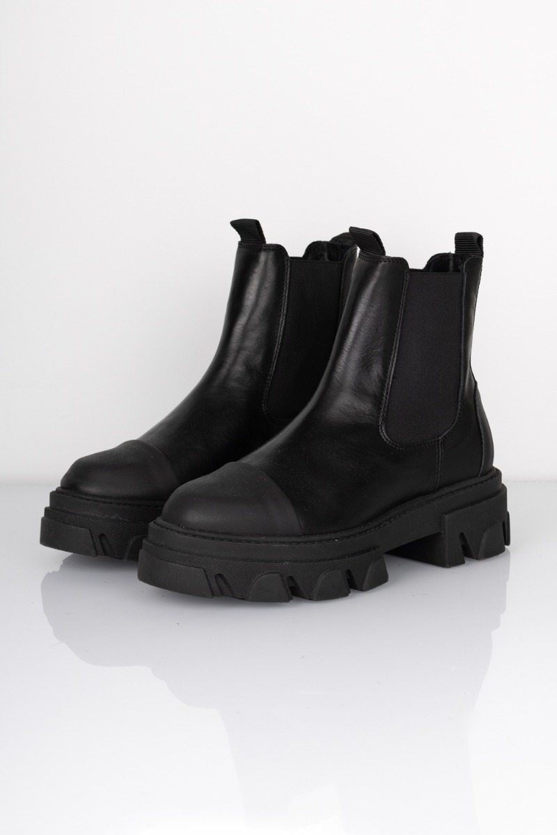 En af vores bedstsolgte støvler fra Pavement i en klassisk sort. Støvlerne er designet med en rå og trendy bund, der giver et cool og chunky look. Støvlen har et sort gummi stykke foran på snuden og ved hælen, der gør den mere slidstærk i det kolde vejr. Støvlen har en blød sål og elastikdetaljer i siderne der gør den behagelig at have på dagen lang.