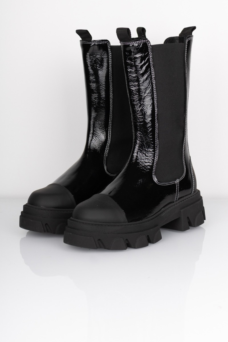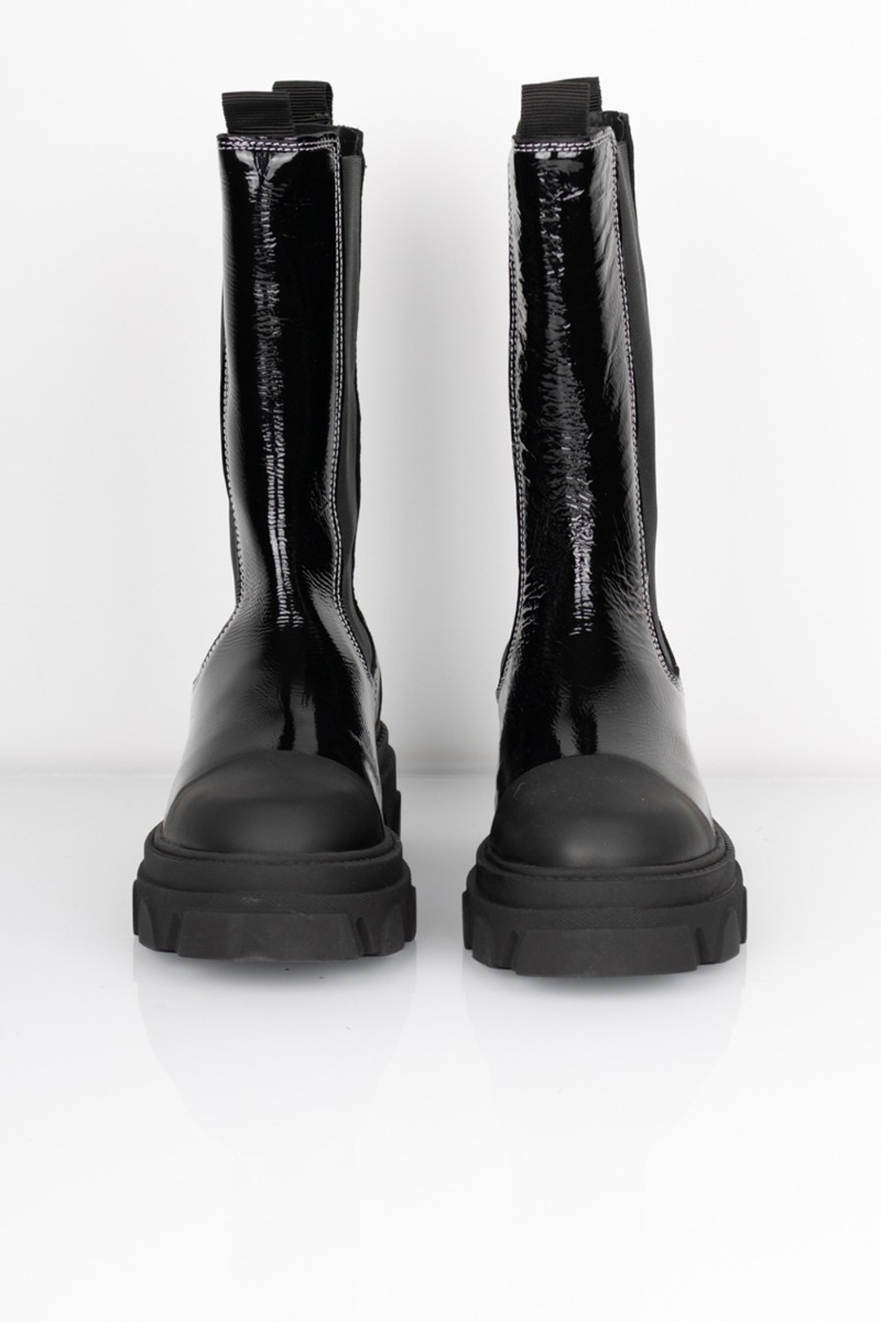 HOT ny støvle fra Pavement i sort "lak-look". Støvlen er super cool med højt skaft og elastikdetalje i begge sider der gør det nemt at komme i og af støvlen. De er designet med en rå chunky bund og har samtidig en virkelig behagelig sål.