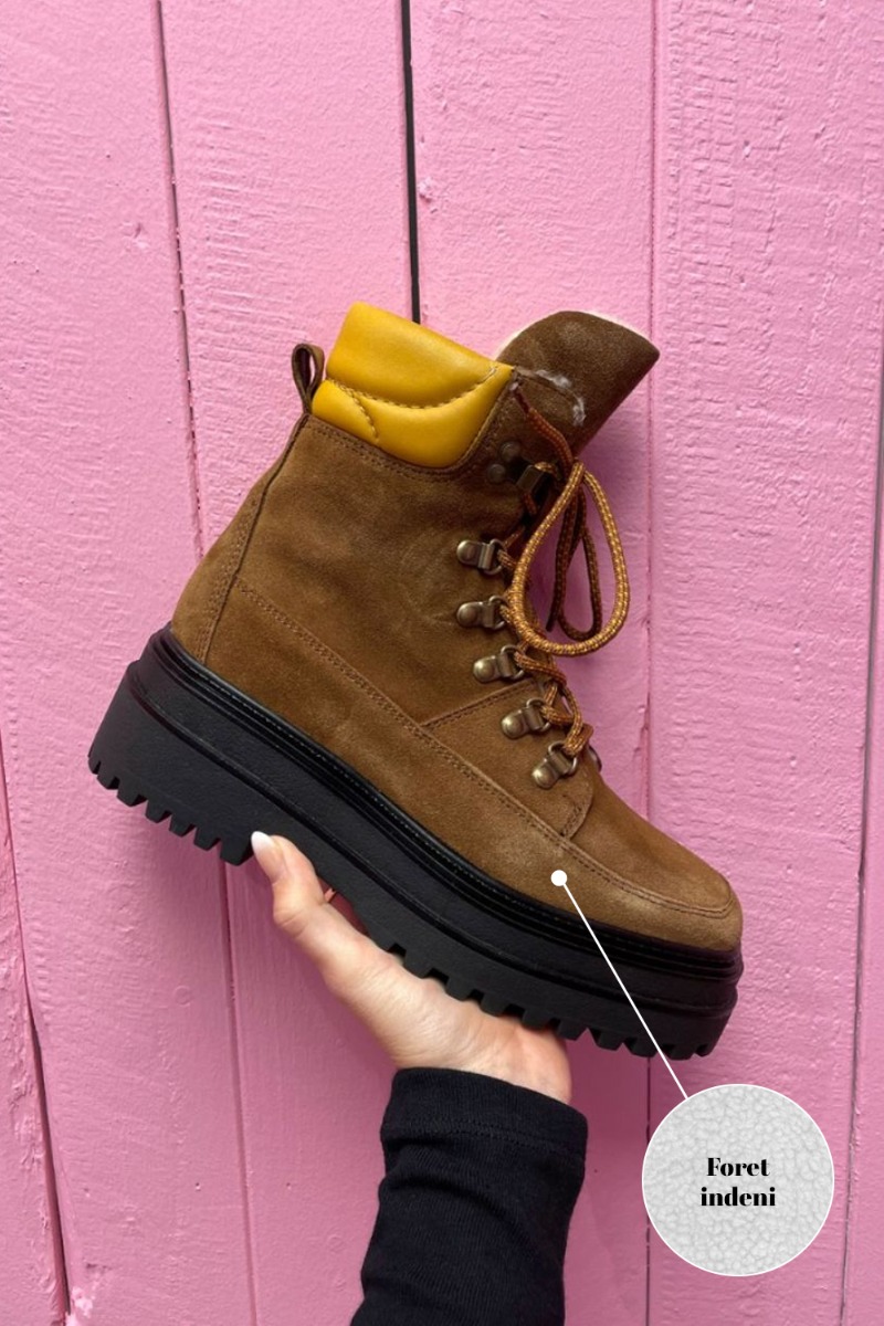 Den sejeste støvle fra Phenumb er landet og den har de fineste detaljer. Støvlen er lavet i et lækkert ruskindsmateriale med en gul detalje ved skaftet og hvidt foer indvendigt der holder dig varm de kolde vinterdage. Den er med snøre foran, chunky bund og er både praktisk og fashion.