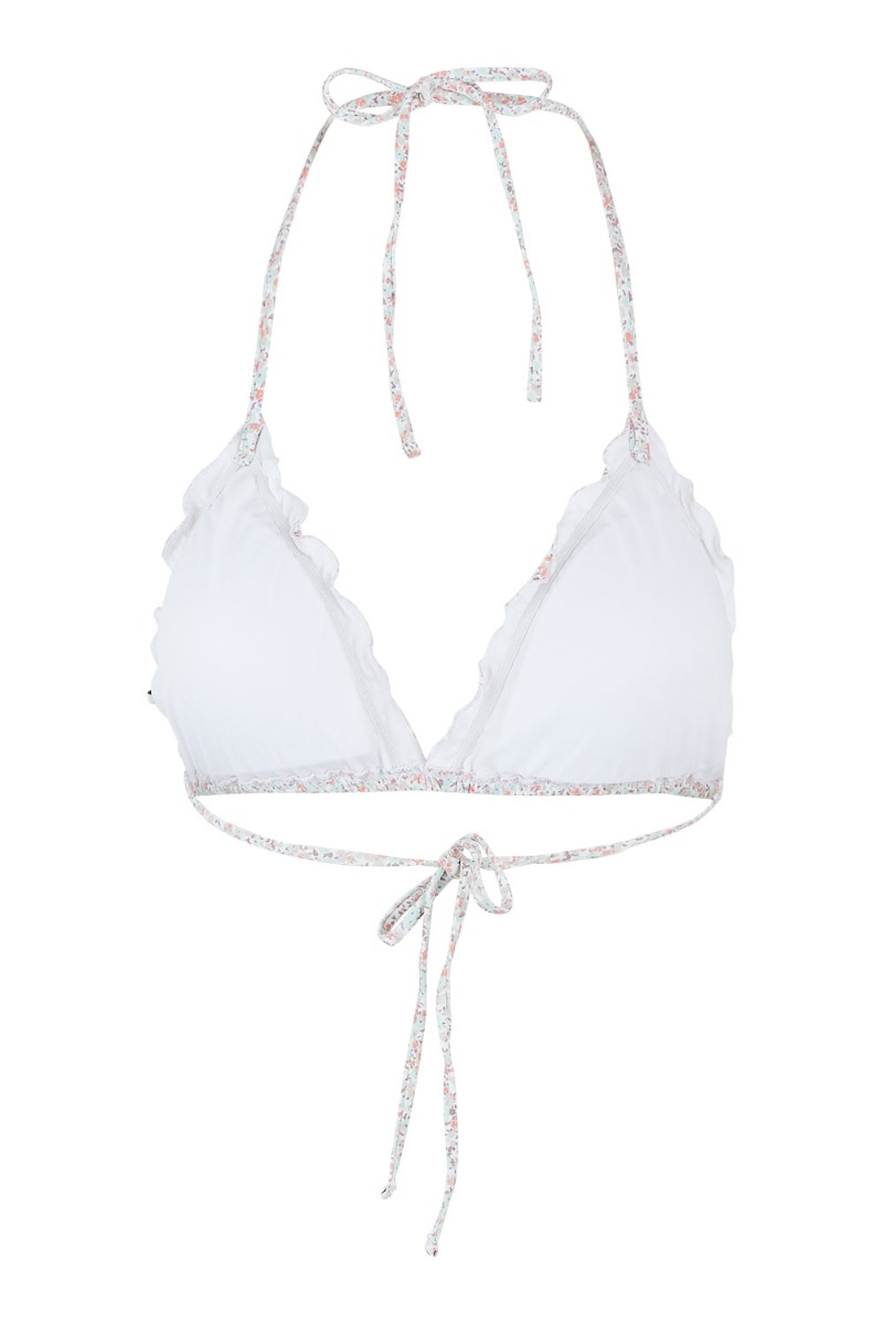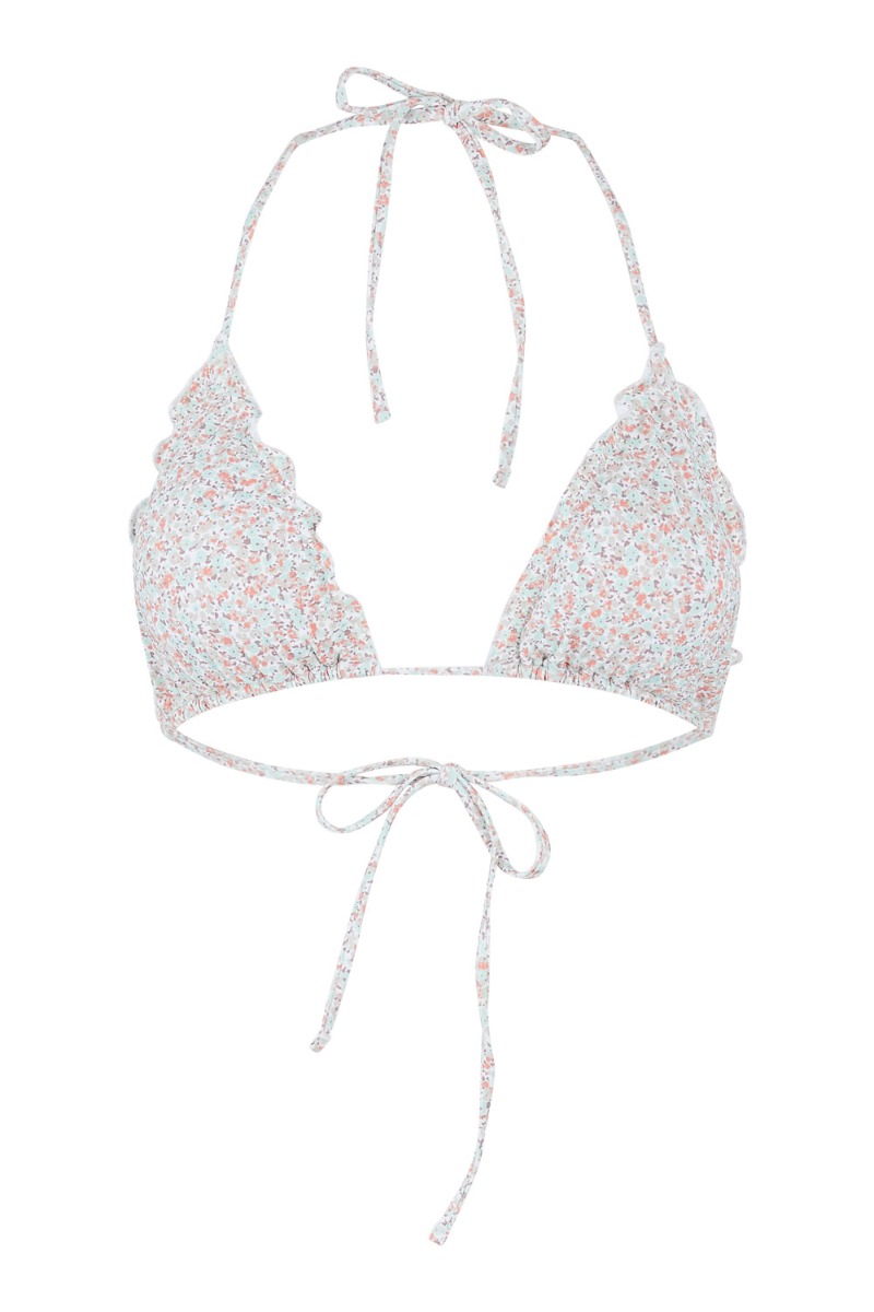 Sød bikinitop med hvid baggrund og orange og grønt blomsterprint. Toppen har aftagelig indlæg og snøres i nakken og på ryggen. Den har de fineste flæsedetaljer i kanten og kan styles med de matchende trusser.