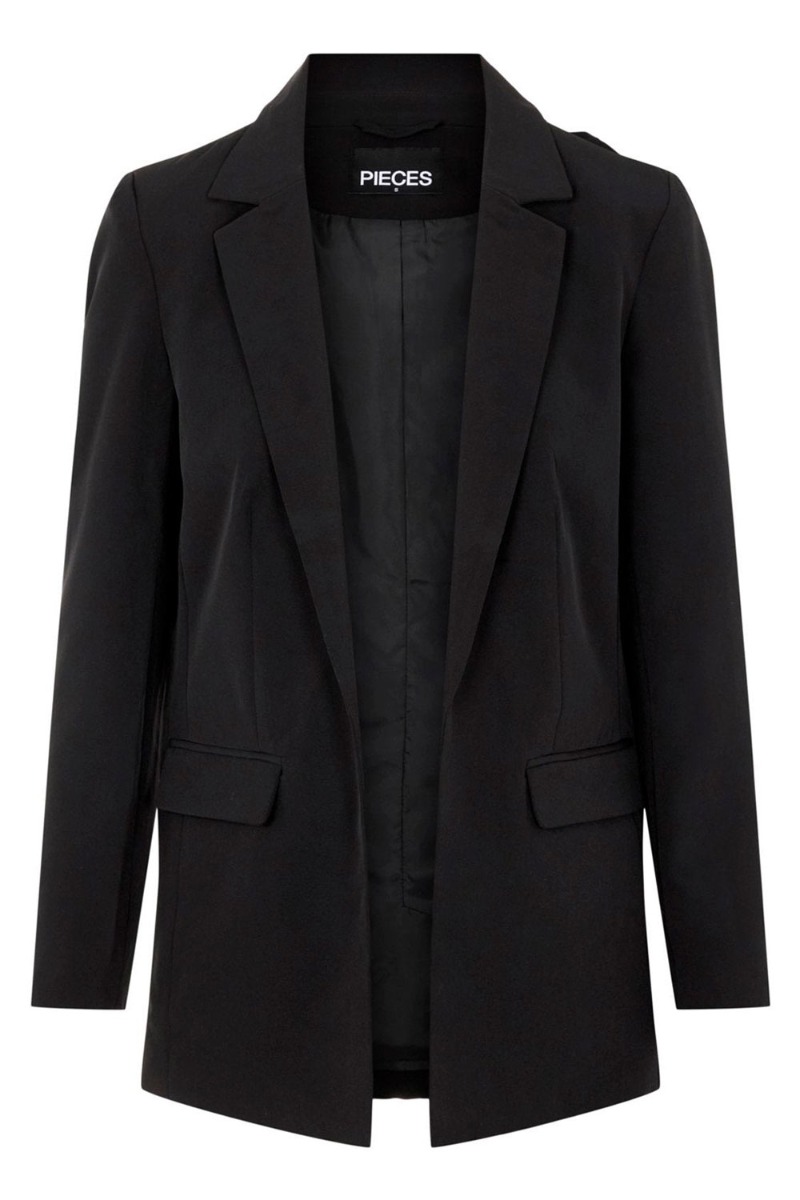Helt enkel klassisk sort blazer går man aldrig galt i byen med. Denne blazer er fra Pieces i et feminin snit uden knap foran der giver et helt stilrent look. Blazeren har små skulderpuder og lommer foran der kan ries op før brug.