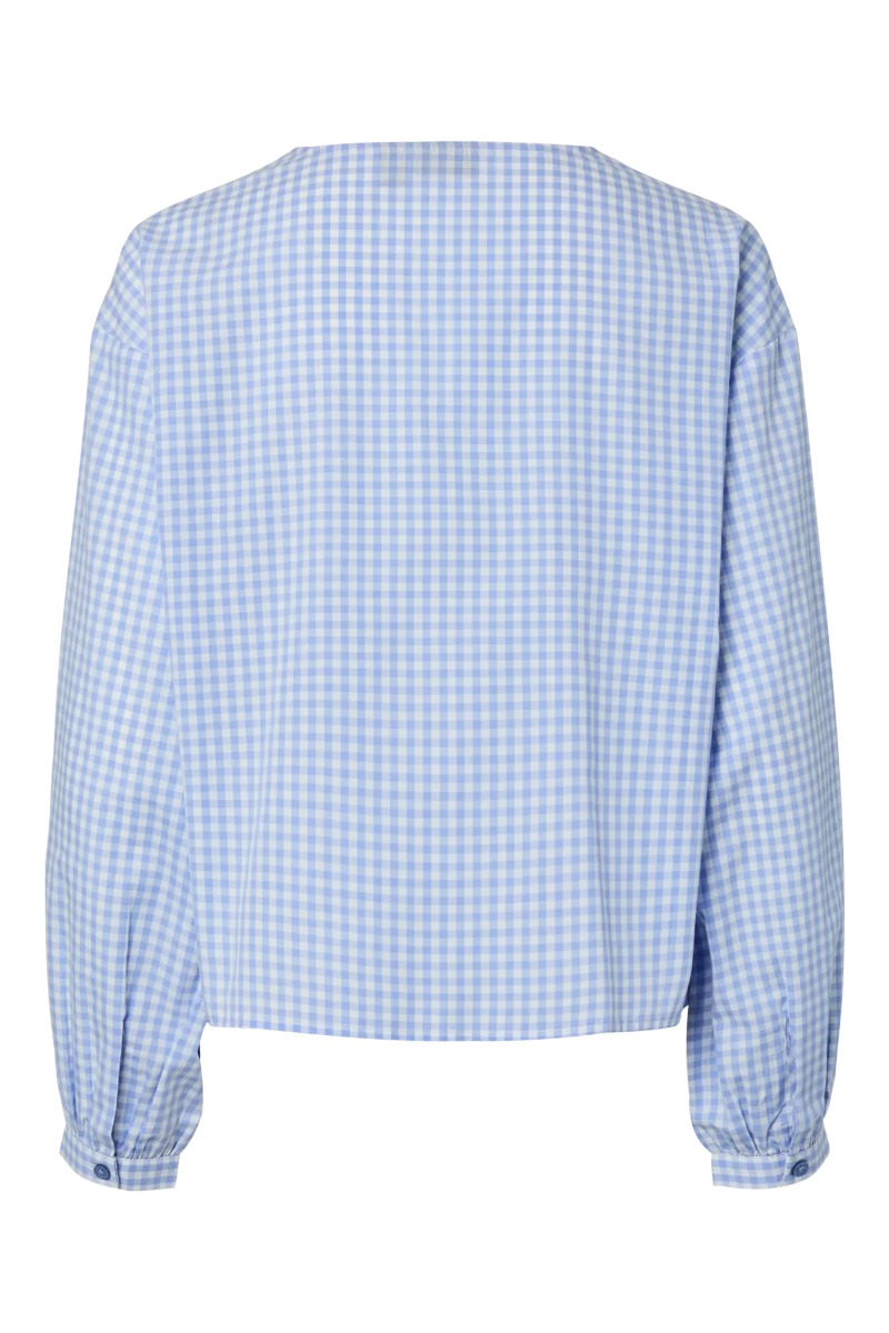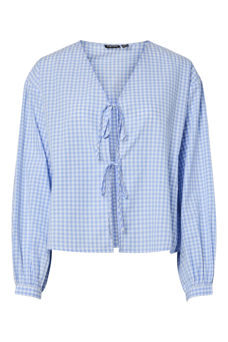 Super fin Bluse med bindebånd fra Pieces. Blusen kommer i det sødeste print i blå med små tern og så har den et fint v-udsnit med snørre man kan binde sløjfer med.