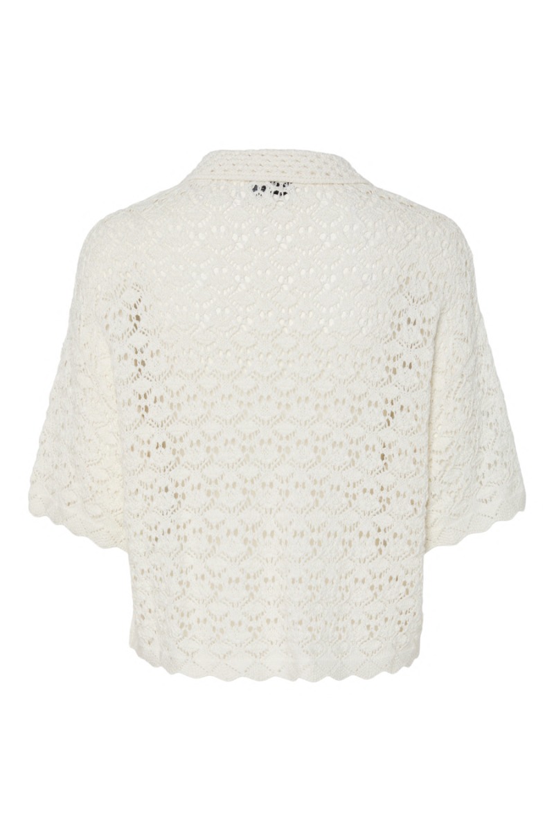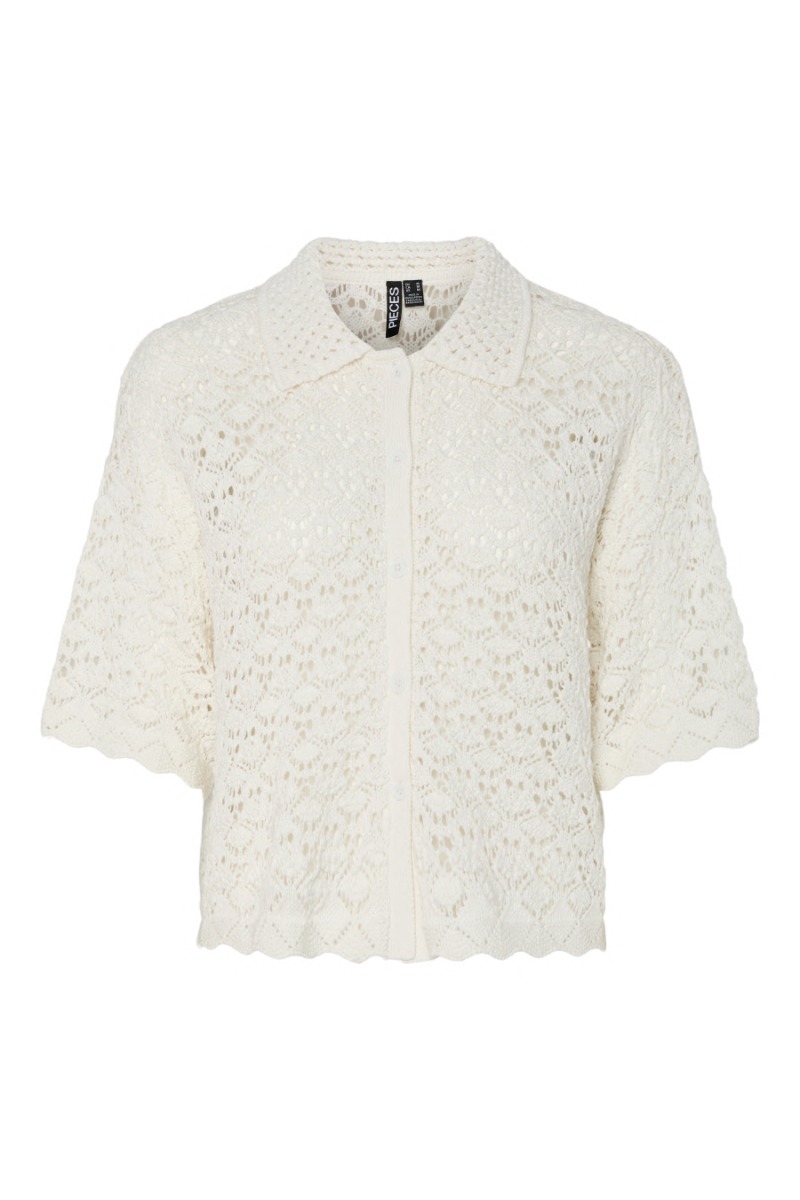 Bluse med korte ærmer fra Pieces. Denne fine strik bluse har knaplukning foran, krave samt korte ærmer. Den er designet i et feminint strikmønster, som er mega fin til denne sæson! Brug den sammen med et par denim shorts eller til en enkel nederdel.