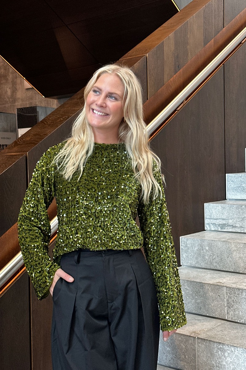 En virkelig fin og festlig bluse fra Pieces i den flotteste, dybe grønne farve. Denne bluse er i velour og prydet med flotte glimtende palietter. Bagpå har den den flotteste fyldige sløjfe, som både gør den feminin og festlig! Style den evt. til den matchende nederdel eller et par sorte bukser!