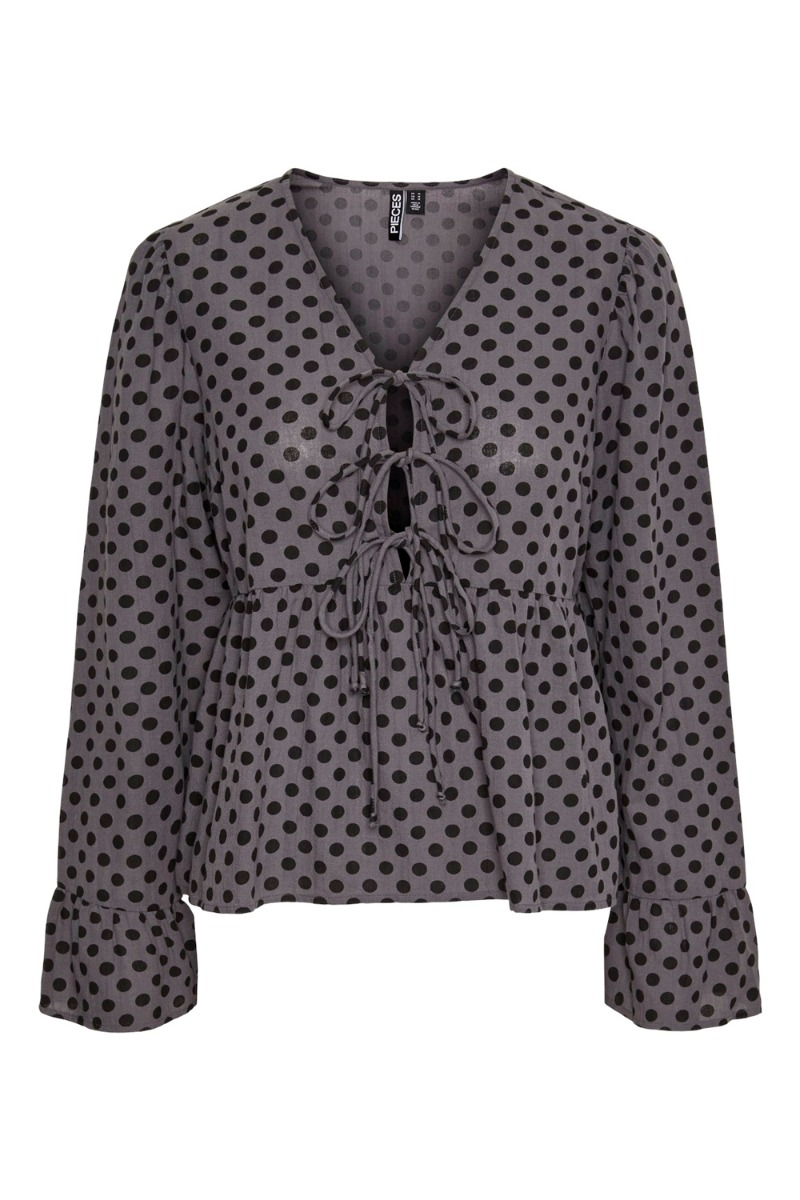 Sød bluse fra Pieces i grå nuancer med prikker. Super cool at stye som sæt med matchende bukser.