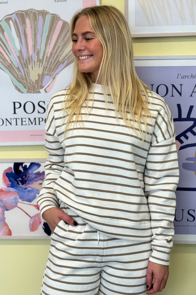 En dejlig og behagelig bluse er landet fra Pieces i hvid med striber i beige. Denne bluse er løs i pasformen og passer fint sammen med de matchende bukser fra samme mærke. Derudover er den plysset indvendig derfor føles det som at tage sin dyne på. Den findes også i hvid med sorte striber.