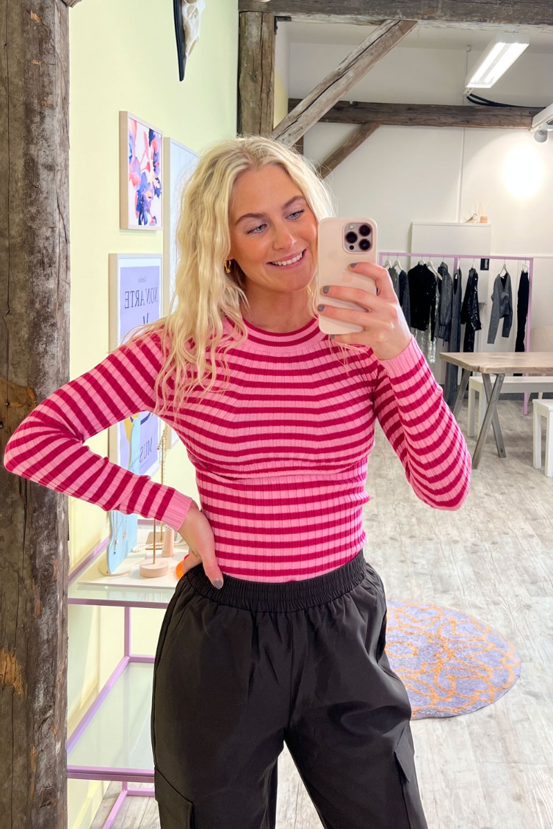Den skønneste stribet bluse fra Pieces. Blusen er stribet i pink og lyserød i den blødeste kvalitet der er som "smør" på kroppen. Den er lavet i et ribbet materiale med masser af stretch, o-neck og lange ærmer. Style den med jeans eller en feminin nederdel.