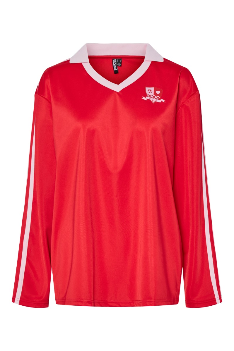 En sej bluse fra Pieces er kommet i rød og i dette sporty look. Det er en helt stor trend denne sæson og vi ser den bare alle steder. Den kan styles til hvilken som helst underdel og findes i flere farver.