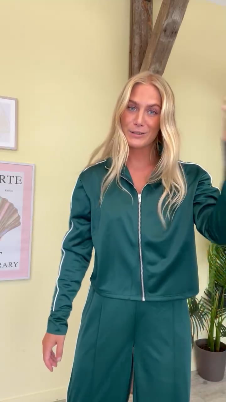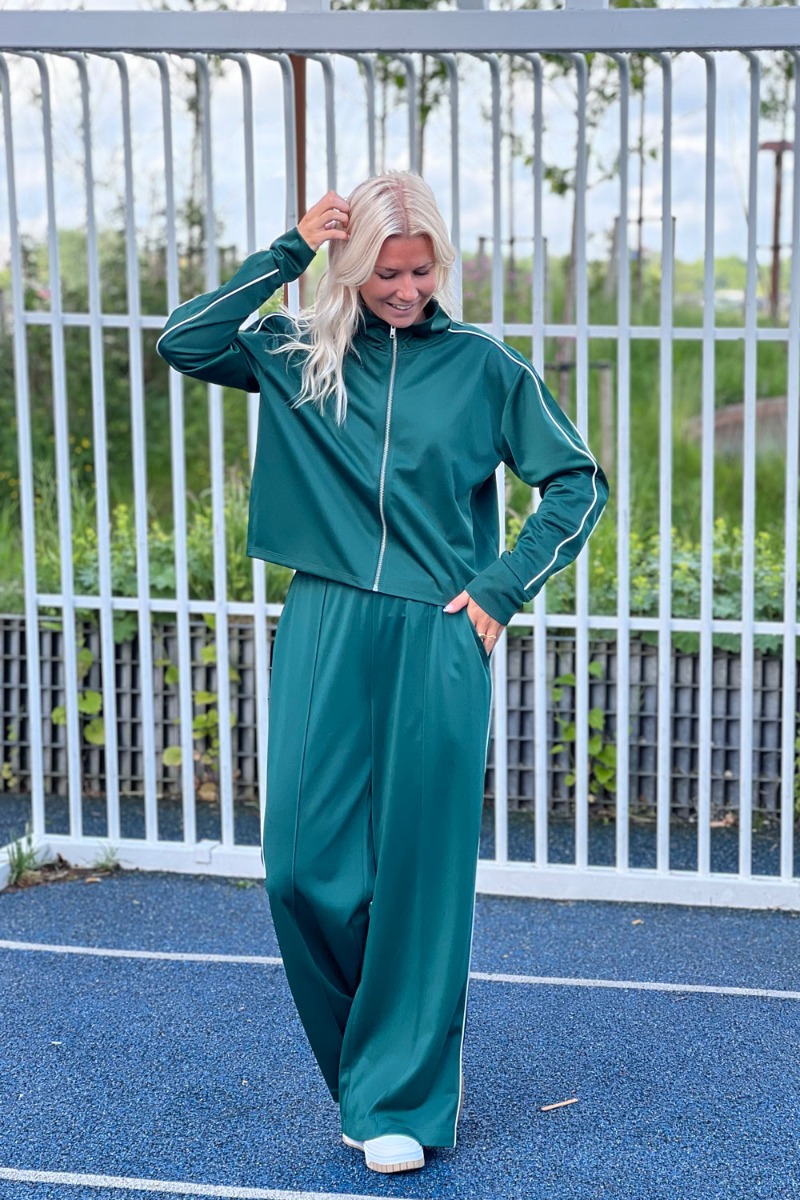En sej i en smuk grøn farve bluse fra Pieces er kommet som en del af et sæt. Det er en track suit model og lavet i dette bløde og behagelig materiale. Der er høj hals og den lukkes med lynlås foran. Du kan nemt bruge overdelen har til en anden underdel eller som en let jakke til sommer. Hele sættet findes i flere farver.