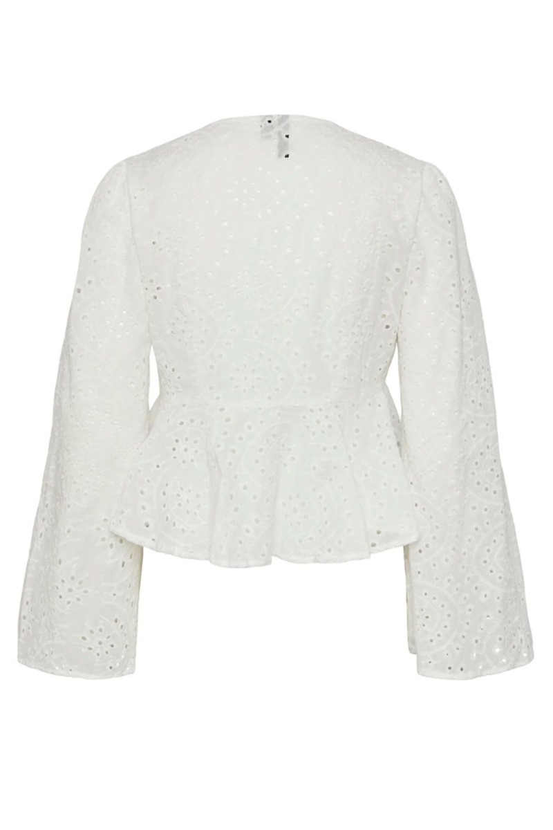Ej fineste blonde bluse fra Pieces i klassisk hvid med bindedetaljer. Den har en løstsiddende pasform og kan fungere som både bluse og cardigan. Den har en fin v-udskæring og store vidde ærmer. I taljen har den en tydelig syning som giver en flot figur på blusen. Styl den til sommeren med en skøn nederdel eller et par rå denim shorts.