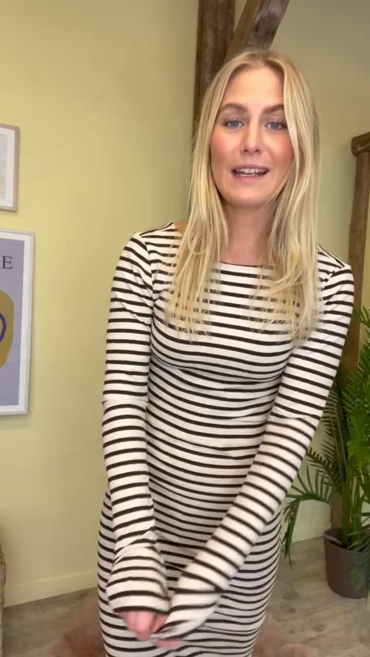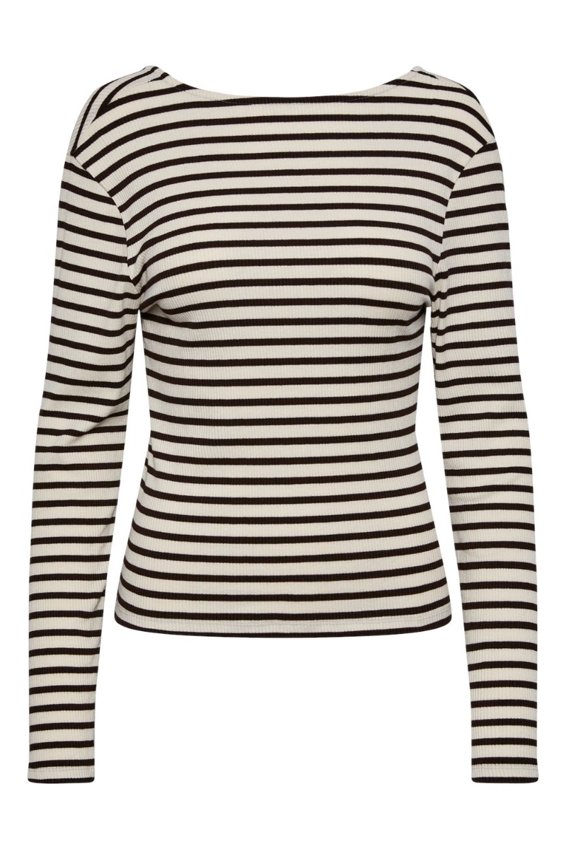 En fin og dejlig blød bluse fra Pieces er kommet i hvid med striber i brun. Den er i en skøn rib kvalitet og derfor er der også godt med stræk i stoffet. Den går dybt ned i ryggen, men du kan stadig bruge en almindelig Bh under. Den er en del. af et sæt og derfor har Pieces også lavet en matchende nederdel.