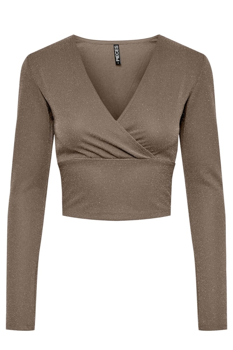 Pieces - Bluse - PC Lina LS Cropped V-Neck Top - Fossil