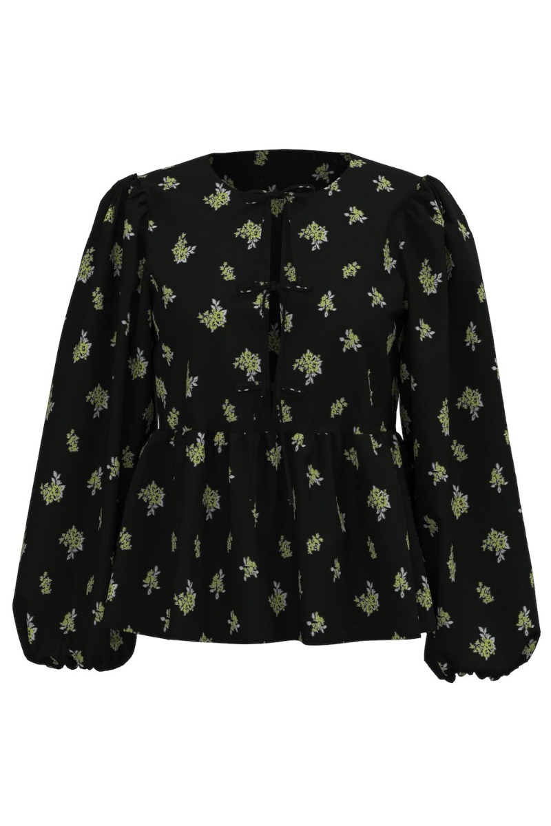 En fin bluse fra Pieces i sort med gult blomsterprint. Den er med peplum i bunden og søde ballonærmer. Derudover er der de populærer sløjfe detaljer foran, som giver et fint og feminint look. Derfor er den også en smule åben foran og vi anbefaler at du bruger en top under. Der er matchende bukser fra samme mærke.