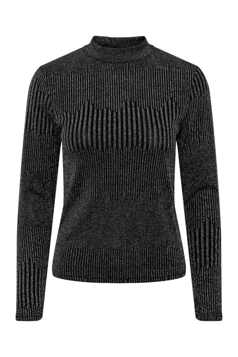 En fin bluse i den blødeste kvalitet i sort og sølvfarve fra Pieces. Denne bluse er i den stribet mønster, hvor striberne varierer i forskellige tykkelser. Den har en smule højhals og er i en dejlig blød stræk kvalitet. Den findes også i en kjole model.