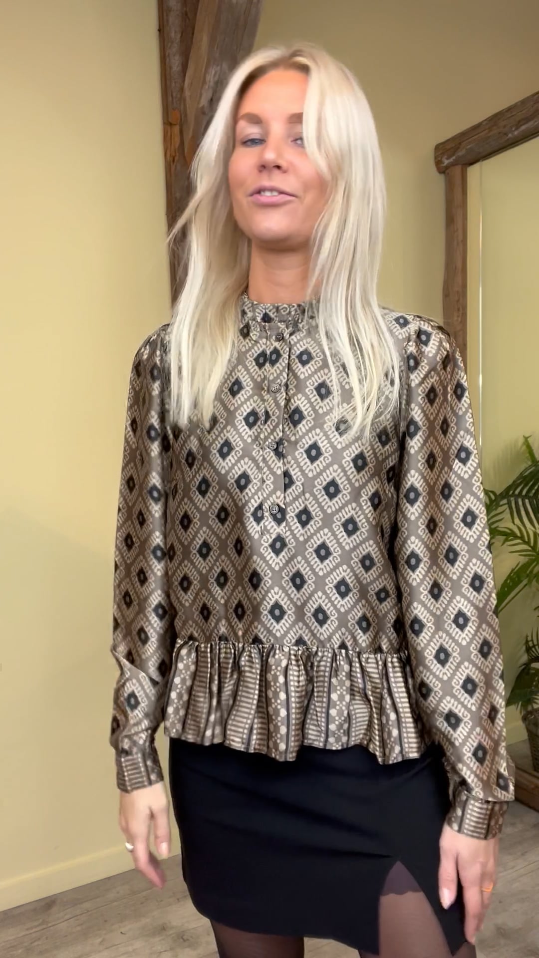 Den bluse er fra Pieces og i det smukkeste brun print. Kvaliteten er helt let og i satin som falder smukt på kroppen. Den har knapper foran som kun går halvt ned, derudover er der peplum effekt i bunden. Ærmerne aflsuttes med en simpel knap og har en lille flæse detalje ved bunden i ærmerne. Brug den gerne til et par jeans.