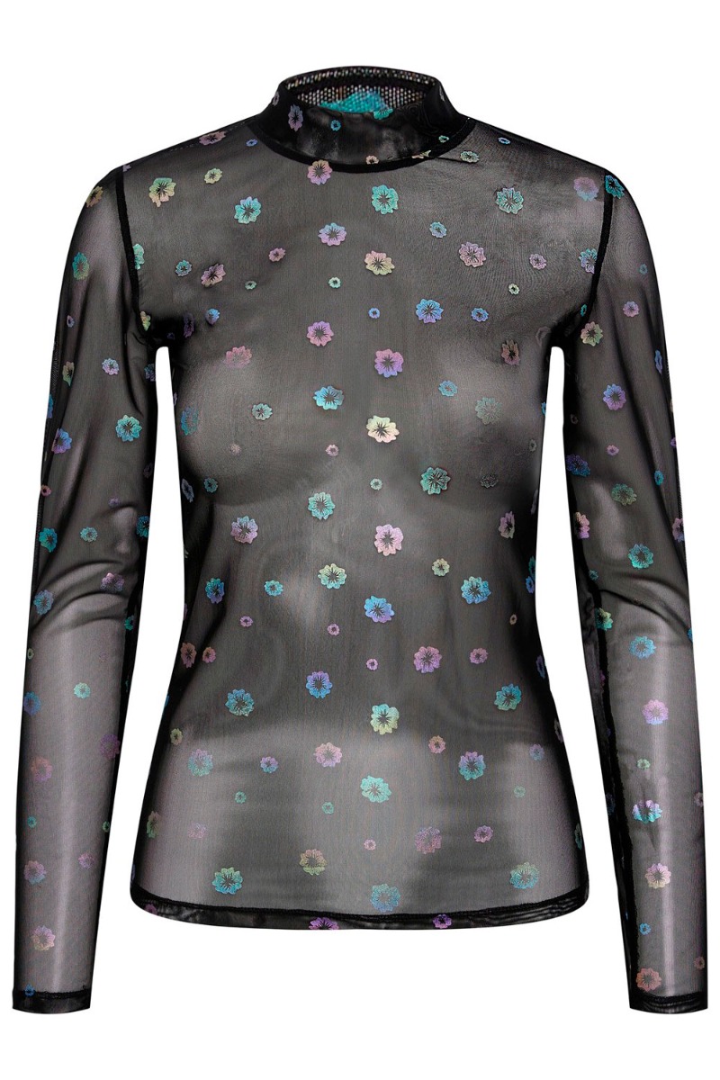 Skøn meshbluse fra Pieces med multiprint blomsterprint. Blusen er i en tynd meshkvalitet og derfor anbefaler vi at man benytter en basistop under. Den har et tætsiddende snit med lange ærmer og høj hals. Den er lavet i en sort bundfarve med metalisk multifarver og designet som små blomster. Brug blusen under kjoler, skjorte, veste eller styl den alene med en blazer over.