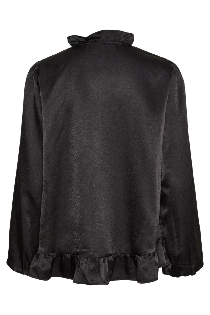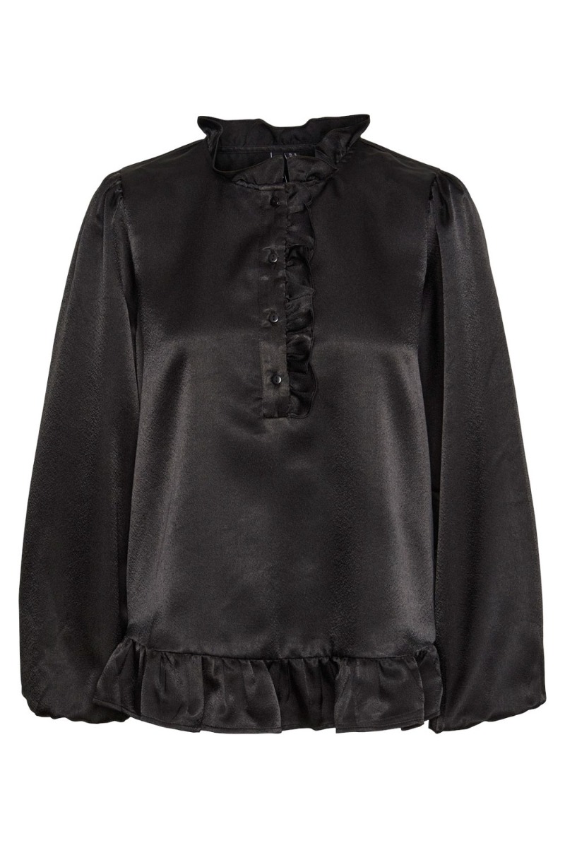 En fin sort bluse er kommet fra Pieces i en shiny kvalitet og med masser af smukke detaljer. Den er løs i pasformen og har knapper der går halvt ned på brystet samt lang i modellen. Derudover er der flæse detaljer ved hals og i bunden. Den fin ballonærmer er med til at skabe det lette udtryk og giver blusen lidt liv. Den findes også i sort.