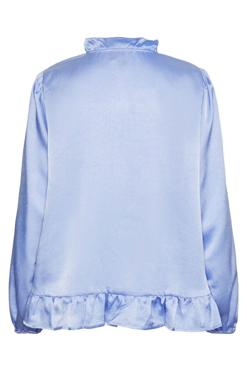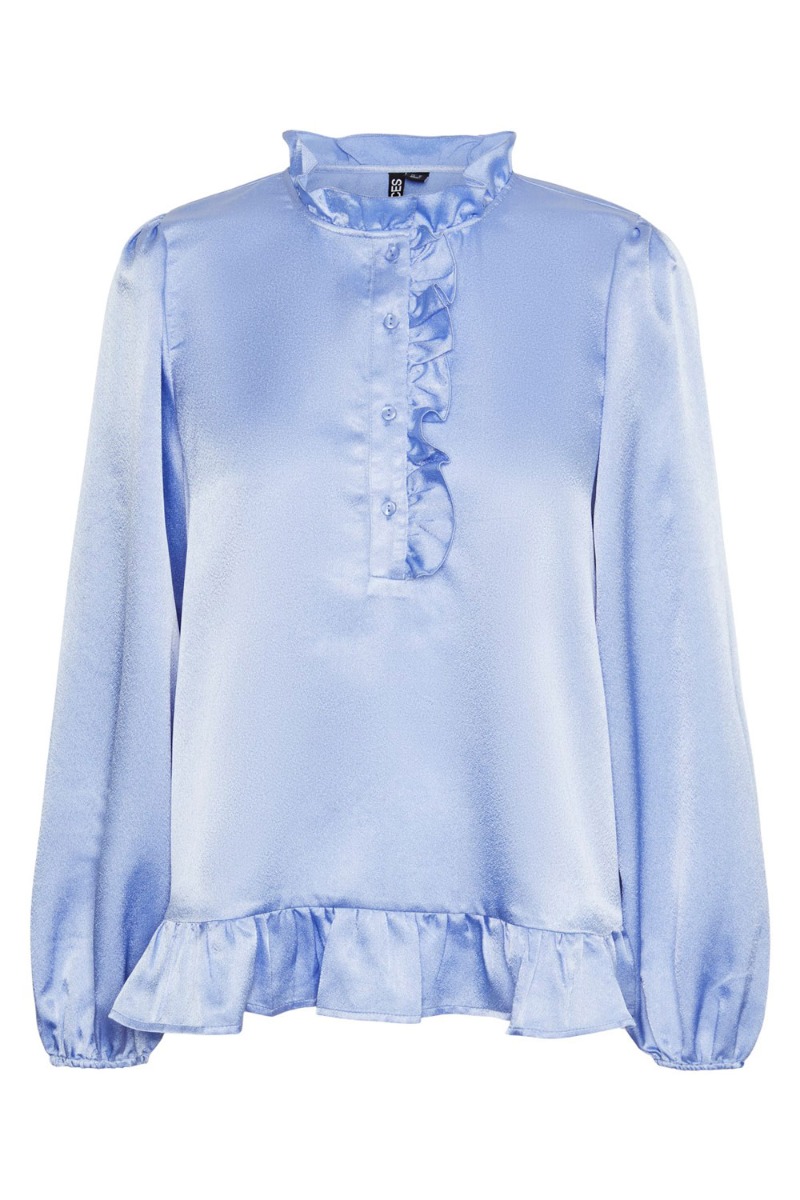 En smuk blå bluse er kommet fra Pieces i en shiny kvalitet og med masser af smukke detaljer. Den er løs i pasformen og har knapper der går halvt ned på brystet samt lang i modellen. Derudover er der flæse detaljer ved hals og i bunden. Den fin ballonærmer er med til at skabe det lette udtryk og giver blusen lidt liv. Den findes også i sort.