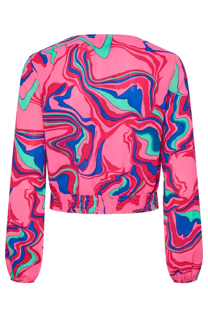 Cropped bluse fra Pieces. En skøn bluse i en pink bundfarve med et vildt og farverigt grafisk print. Blusen er cropped i pasform med lange løse ærmer og snøredetalje foran på blusen. Bagpå har den en lækker smockeffekt som giver en flot pasform på blusen.