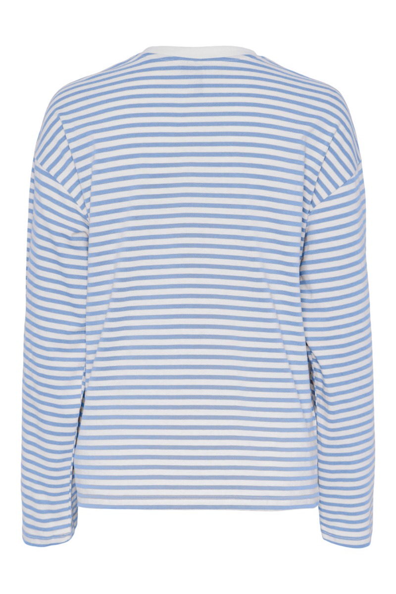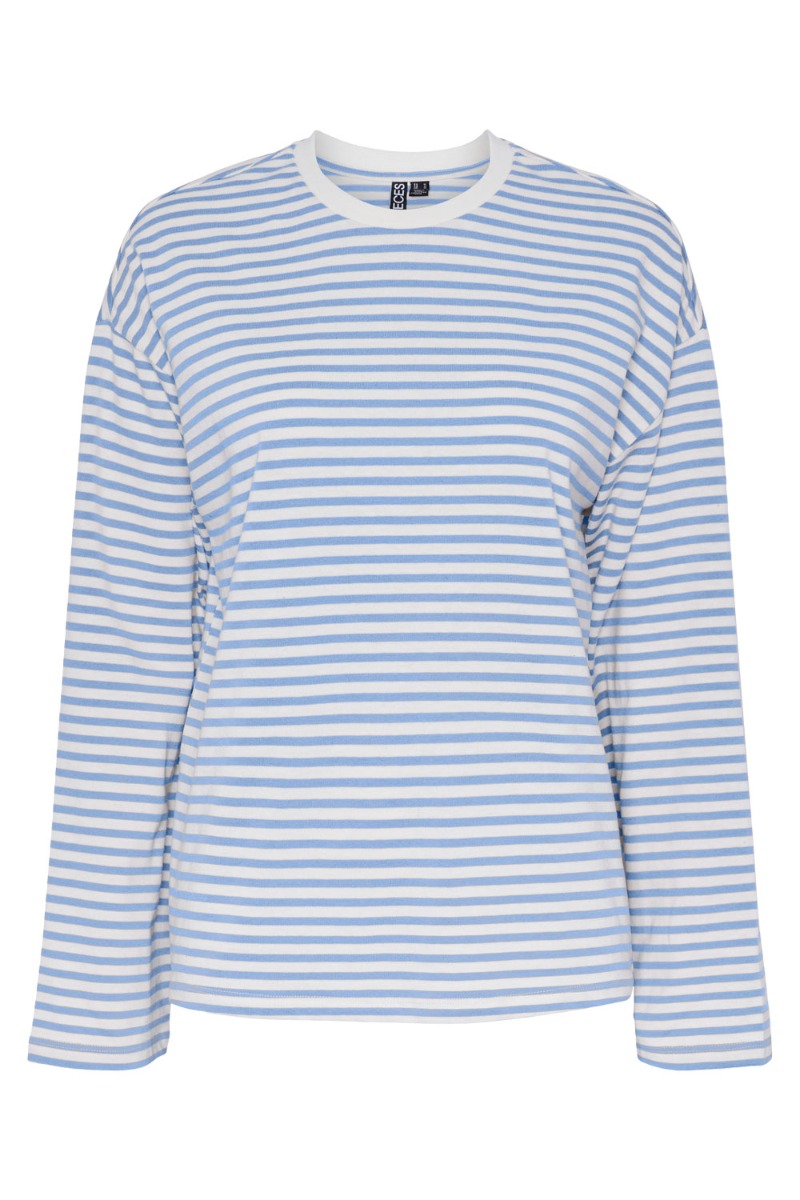 Den fineste bluse fra Pieces i blå og hvid stribet. Den er med rund hals og er løs i pasformen. Style den til et par jeans eller shorts her til sommer. En perfekt sommer bluse at have i garderoben hvis du spørger os!