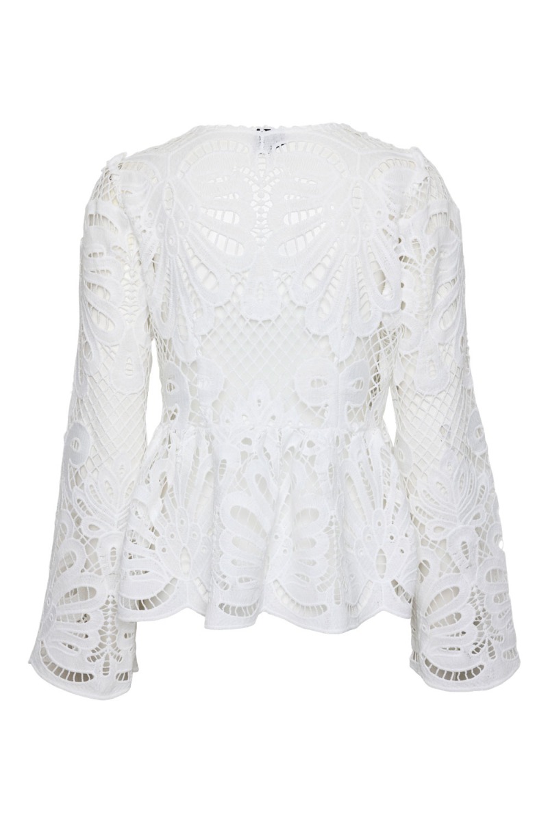 En fin bluse fra Pieces i en lækker og smuk blonde kvalitet. Den er med gennemsigtig og vi anbefaler derfor at du bruger en top under. Den er med peplumeffekt og kan knappes op så den er ammevenlig. Derudover den fin til både hverdag og fest.