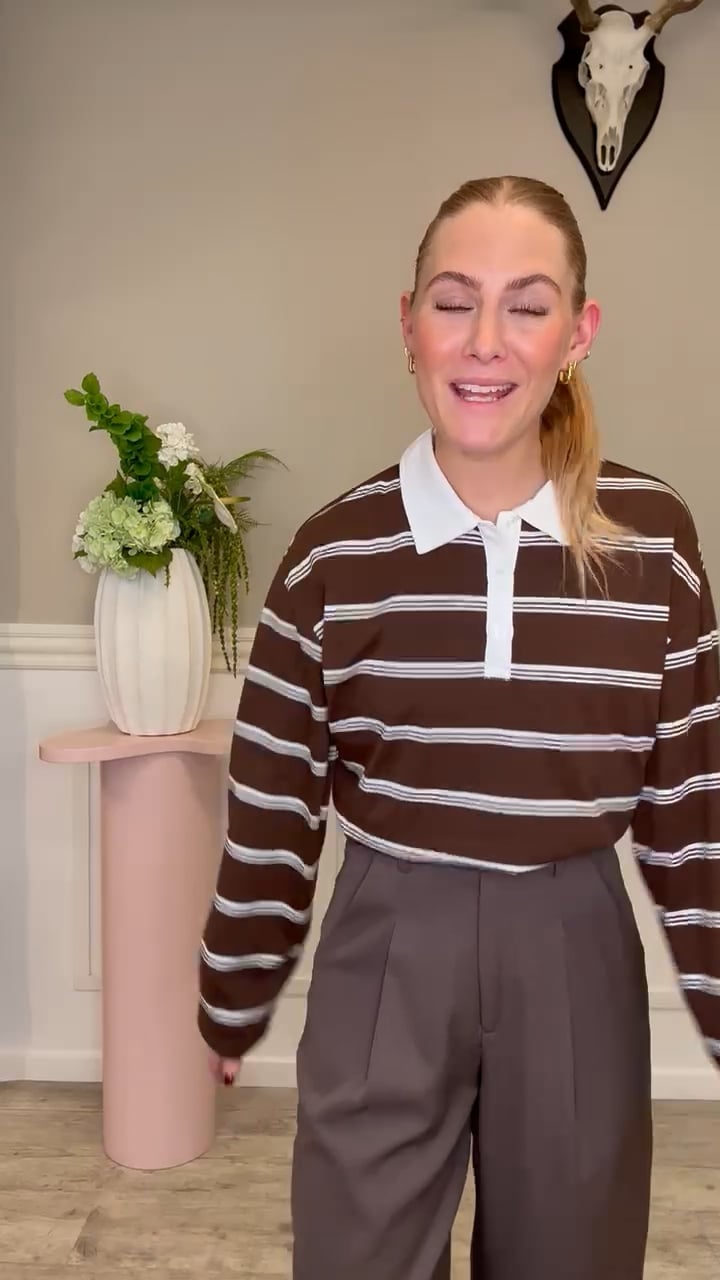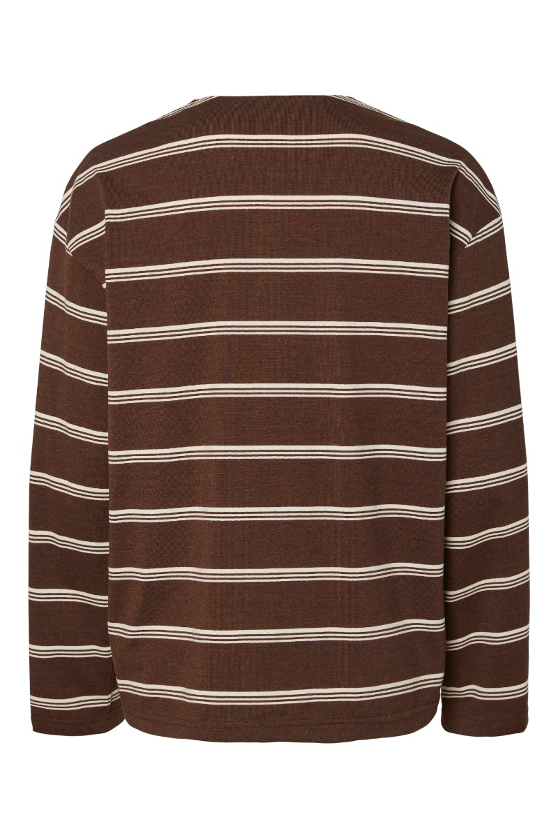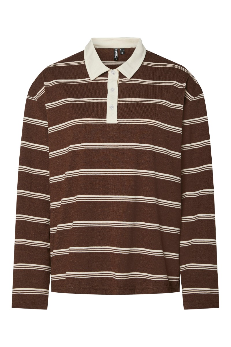 En fin polo bluse i den smukkeste brune farve er kommet fra Pieces. Den er med striber i hvid og brun hvor der er sat en krave ved halsen i hvis som står i fin kontrast til den mørke farve. Den er løs i pasformen og perfekt til både jeans eller nederdel. Den er dejllig blød i kvaliteten og derfor også super at have på til hverdag.