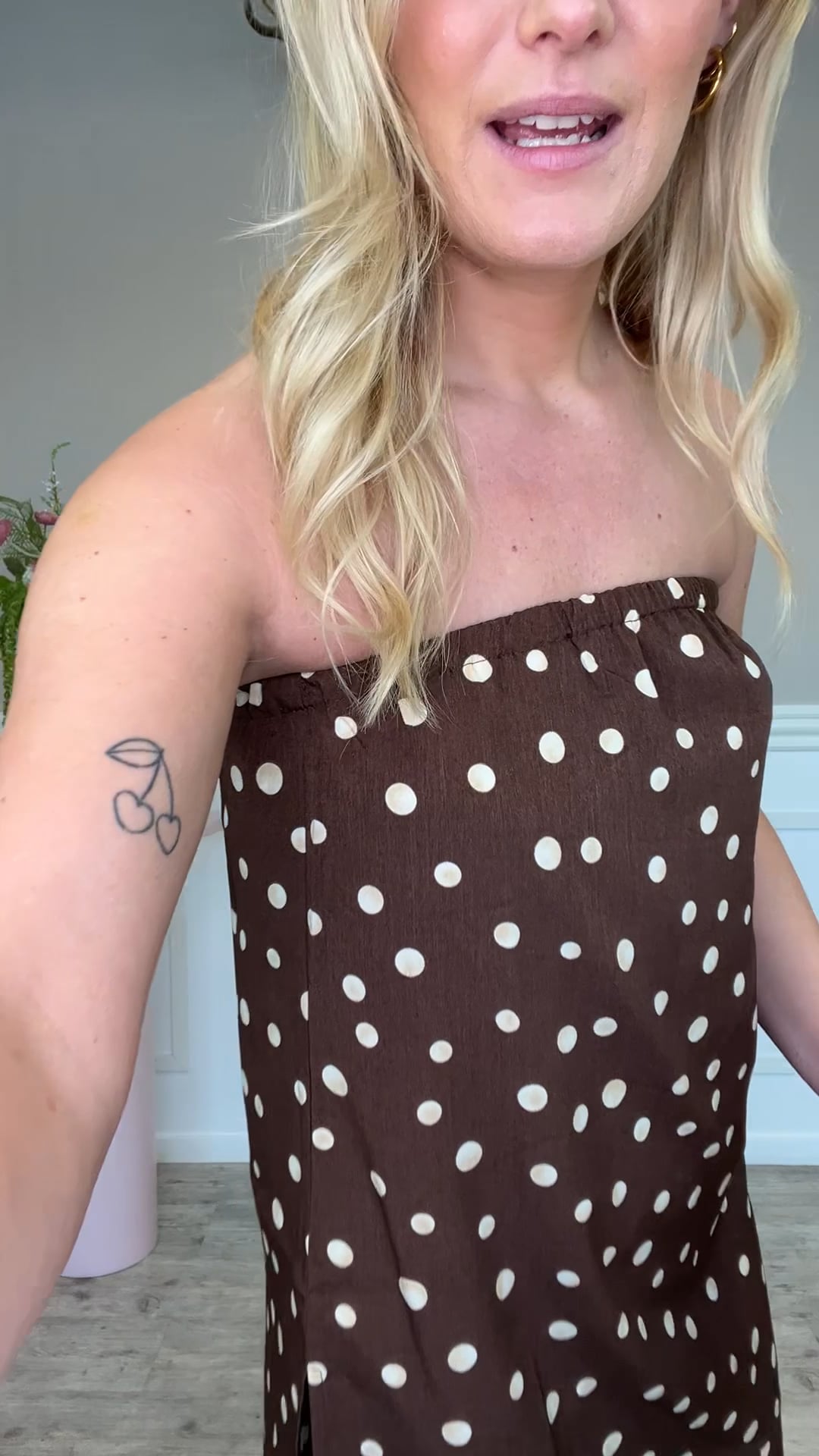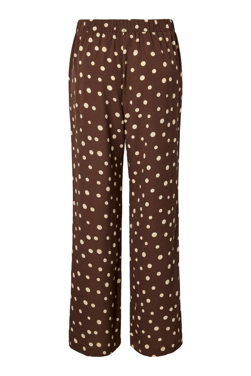 Et par gode bukser fra Pieces i brun med hvide prikker. De er lette i kvaliteten og har elastik i taljen. Derudover er den vide i benene og de er behagelige at have på hele dagen. Der findes en matchende overdel så du nemt kan lave et sæt.