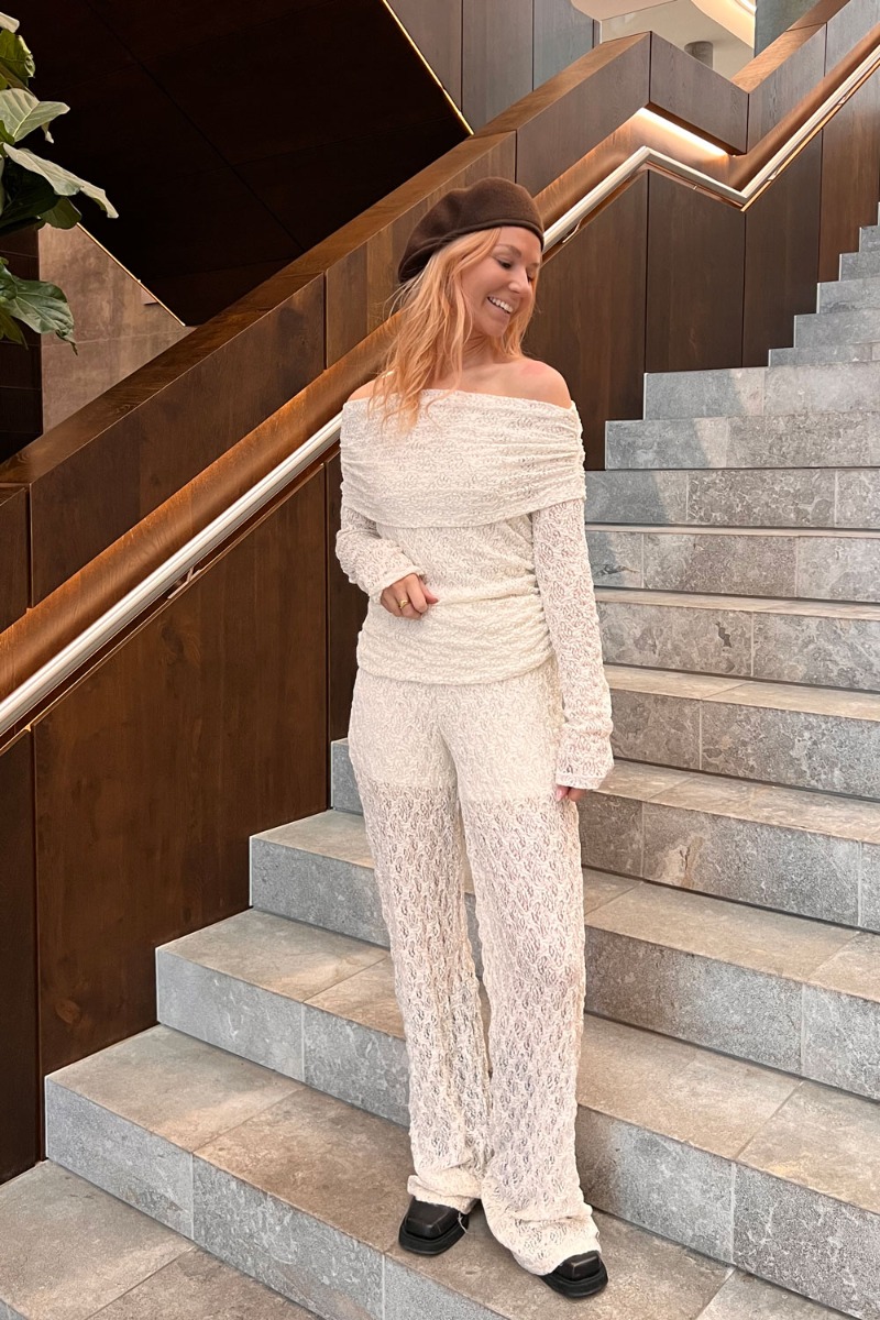 Wauw smukke blondebukser i hvid fra Pieces. Et par behagelige og løstsiddende bukser med elastikkant i taljen og som er foret med en hvid indershorts. Styl dem til den matchende off-shoulder bluse for et fuldendt blondelook.