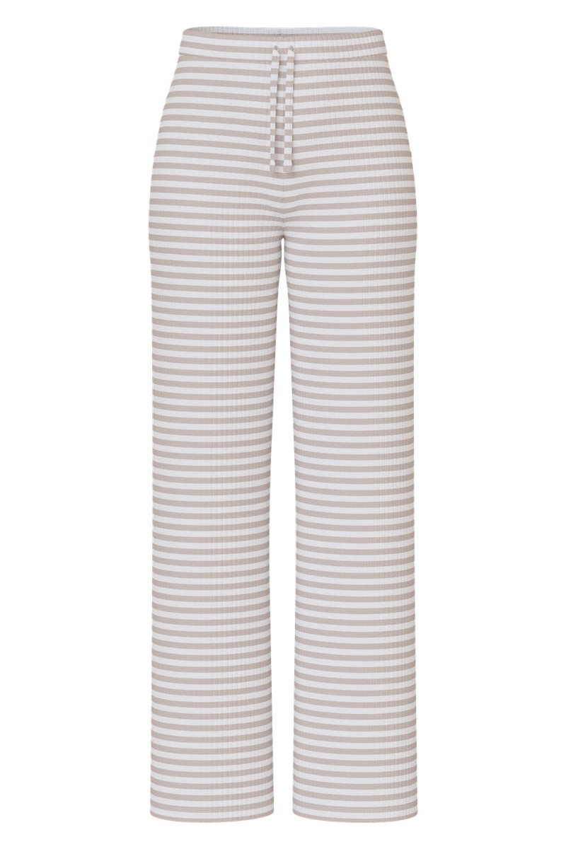 En par søde bukser fra Pieces er kommet som en del af et sæt med striber i hvid og beige. De er i den blødeste rib kvalitet og med elastik i taljen som markeres med en lille sløjfe. Der findes en matchende overdel og hele sættet kan fåes i flere farver.