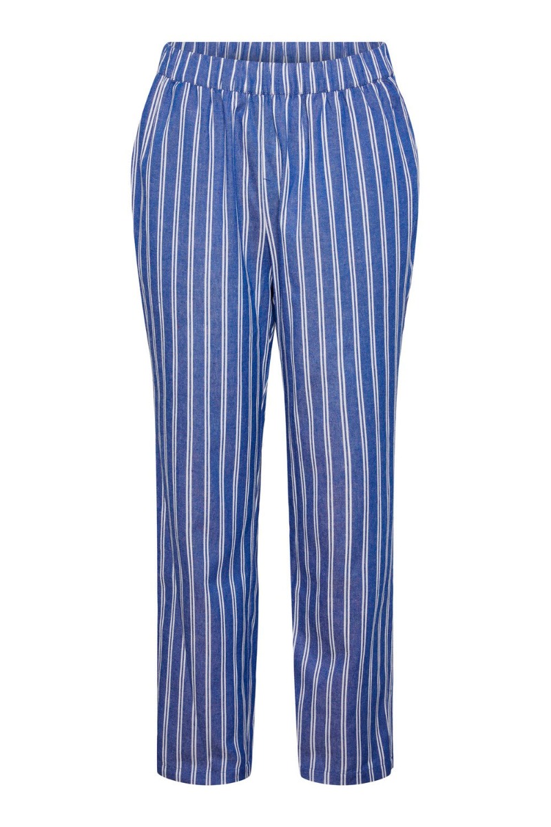 Cool blå og hvid stribet bukser fra Pieces. Et par skønne løstsiddende bukser med elastikkant i taljen og lommer i siderne. Bukserne har et højtaljet fit og med lige ben. For et fuldendt look er det oplagt at style bukserne med den matchende skjorte.
