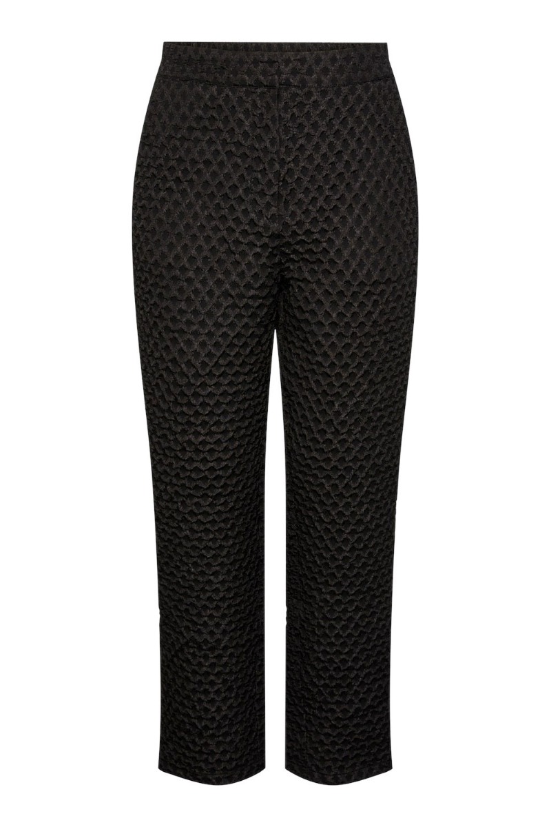 Disse flotte bukser er i den klassisk sort farve med struktur i stoffet så det giver et smukt og feminit udtryk. De er fra Pieces og der findes en matchende top til. Derudover er den med elastik i taljen bagpå, derfor har den stadig den glatte forsiden og har lukkes de med både knap og hægte. De er højtaljet og super fine også til en simple t-shirt.