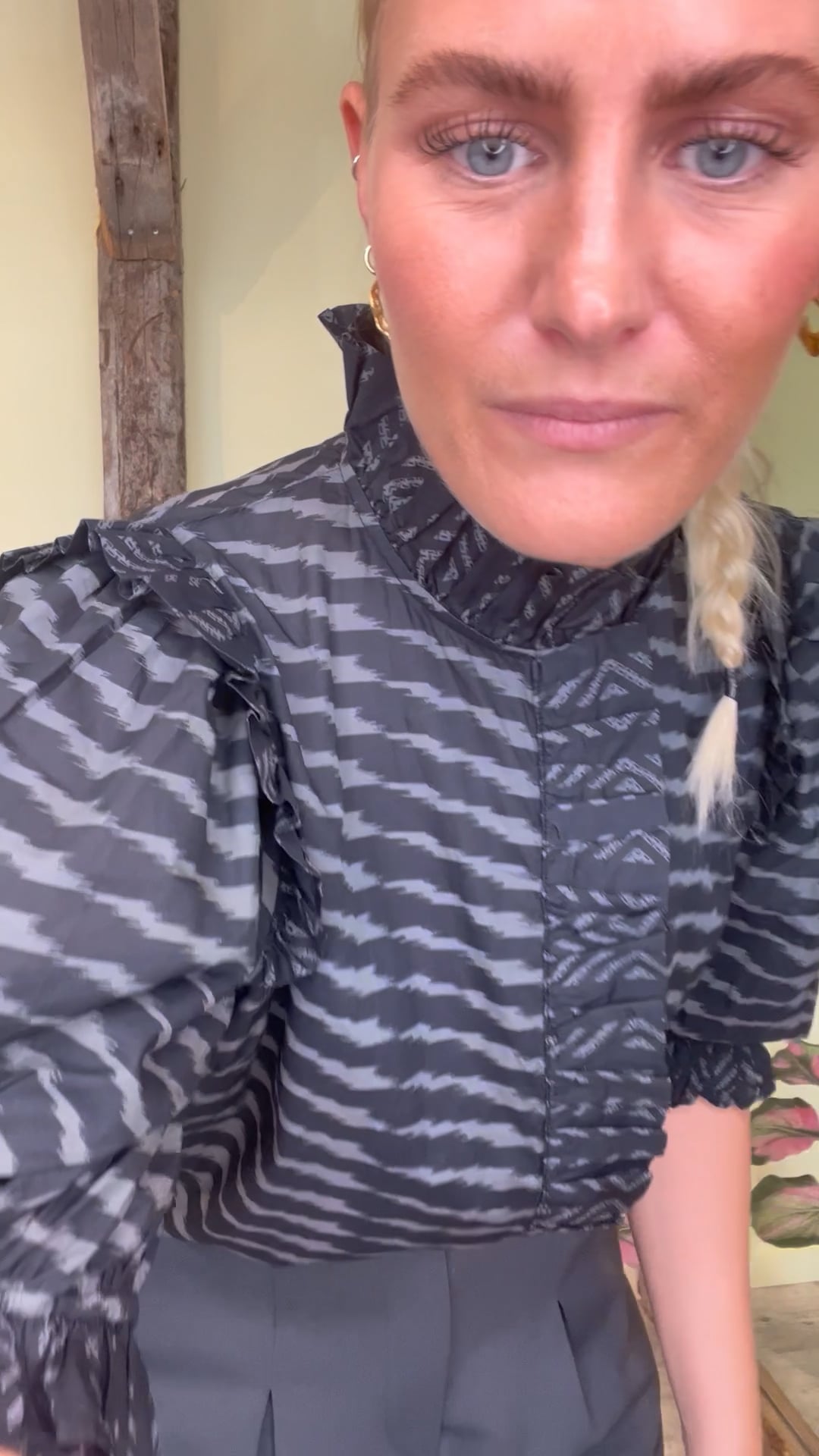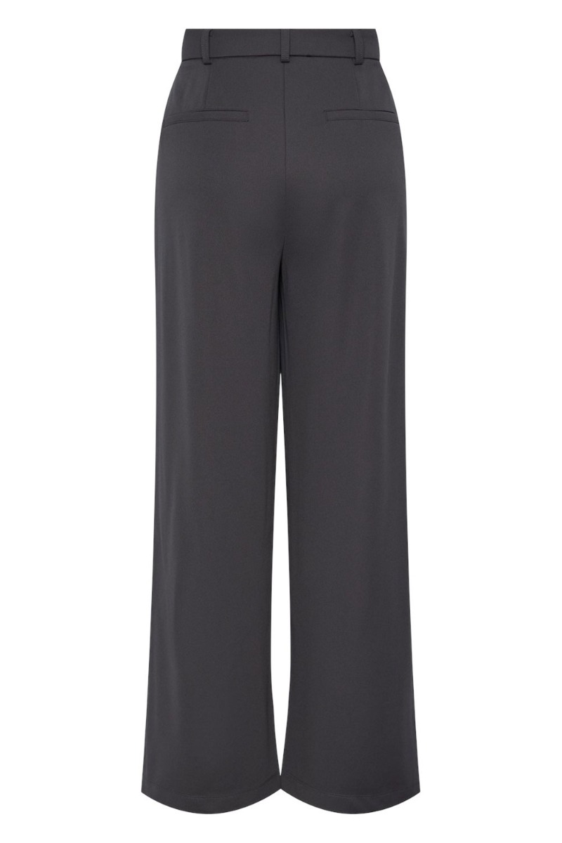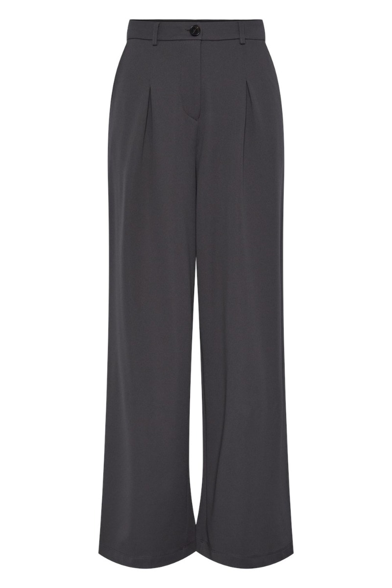 Et par seje bukser fra Pieces er landet i en smuk grå farve. Bukserne er med vide i benene og en smule stræk i kvaliteten men stadig fast. Der er bæltestropper og lukkes med en synlig knap samt lynlås foran. Bukserne findes også i sort.
