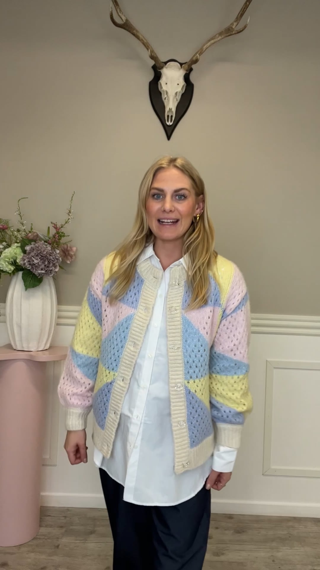 Cardiganen har et blødt og hyggeligt udtryk med fine pastelstriber i lyserød, blå og gul. Det geometriske mønster giver den et legende look, men farverne holder den stadig rolig og feminin. Strikken ser let og luftig ud, så den passer perfekt til forår og kølige sommeraftener. Knaplukningen gør den nem at style både åben over en top eller lukket som en bluse. Den vil være rigtig fin til jeans, lyse bukser eller en enkel kjole.