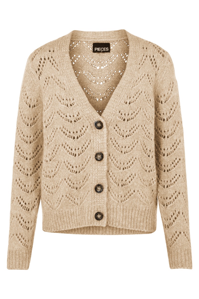 Beige cardigan med hullet mønster fra Pieces. Cardiganen er lavet i den lækreste bløde kvalitet med knapper foran og v-udskæring. Den er løs og super nem at style over dine kjoler og skjorter.