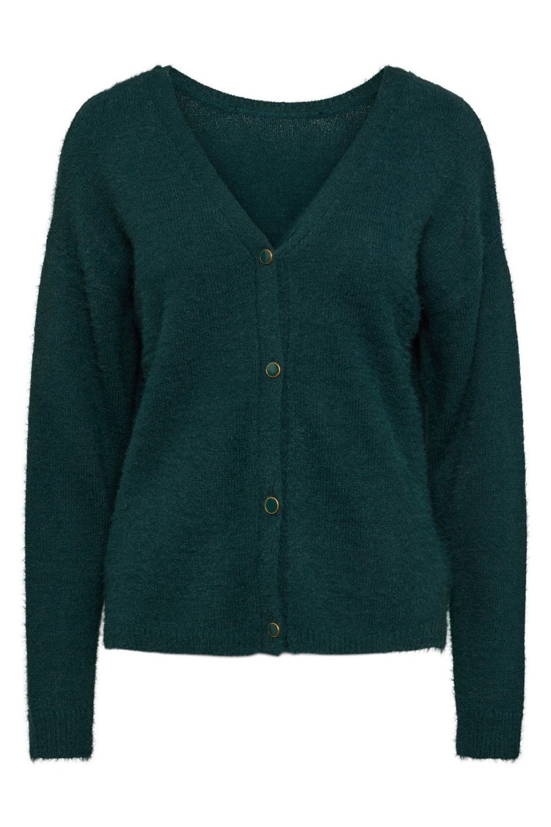 Den BLØDESTE cardigan fra Pieces med v-udskæring og knapper foran. Den er i den smukkeste grønne farve som er en af de HOTTESTE farver denne sæson. Cardiganen er designet i et lækkert fluffy materiale og i en kort model der er anvendelig over et par jeans eller kjole.
