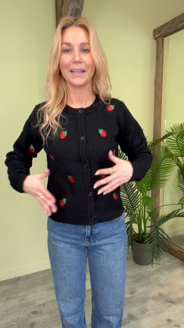 Ej virkelig sød strik cardigan fra Pieces! En sød og feminin cardigan i en klassisk sort nuance pyntet med små røde jordbær. En rigtig fin forårsstrik som også nemt kan styles hele året rundt. Den kan styles til både nederdele og jeans og er i en blød behagelig kvalitet.